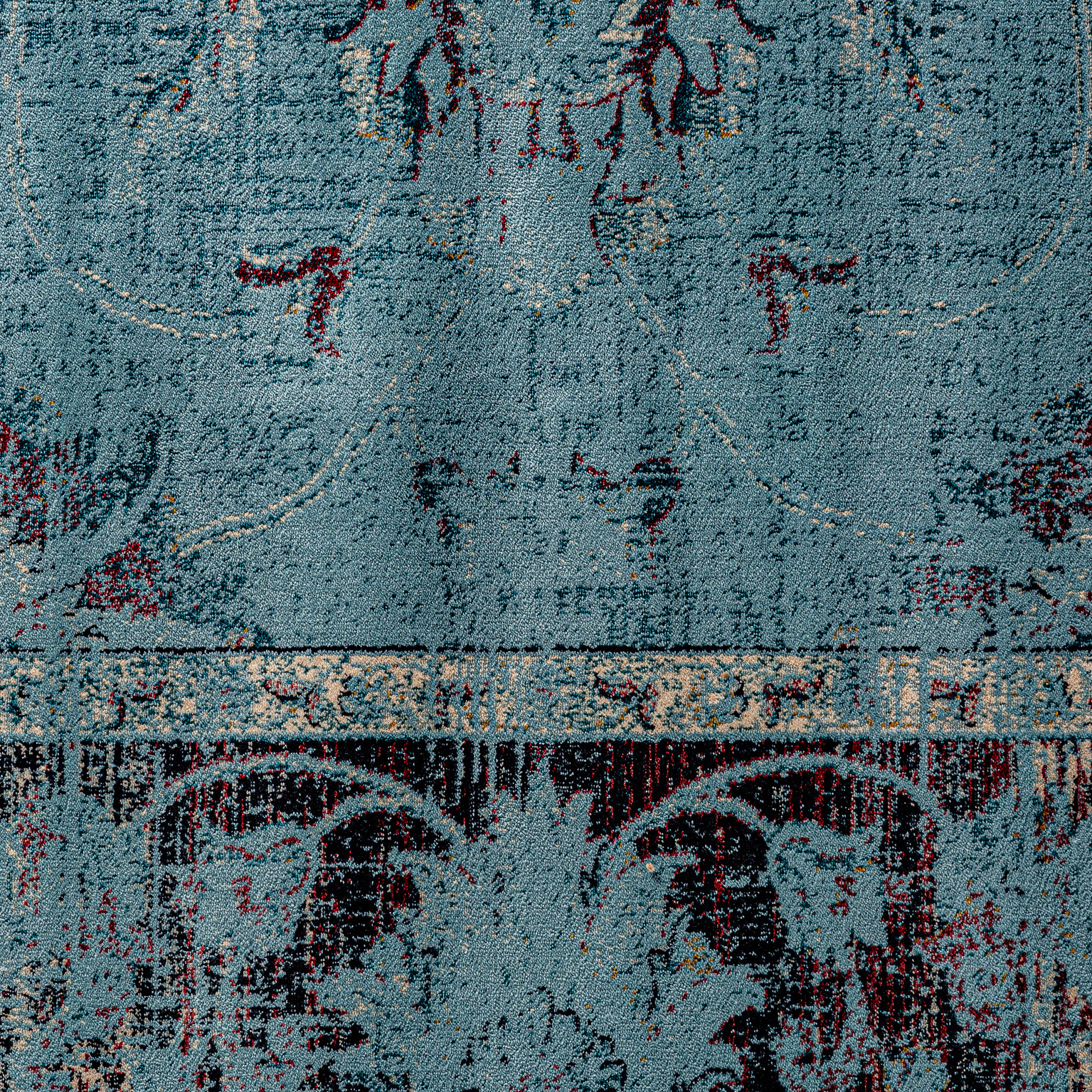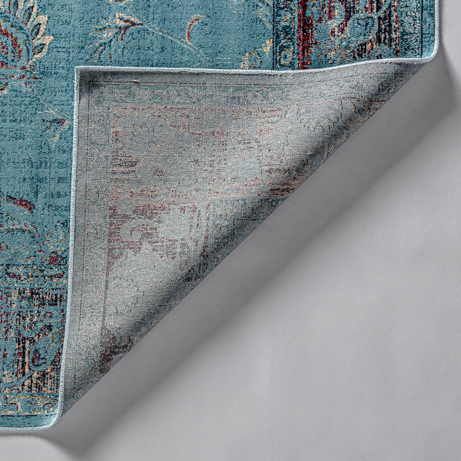 Alfombra rectangular suyay, en color turquesa, de estilo colonial. Fabricado en viscosa. Algodón, 33% poliéster, 20% latex, 4% viscosa.