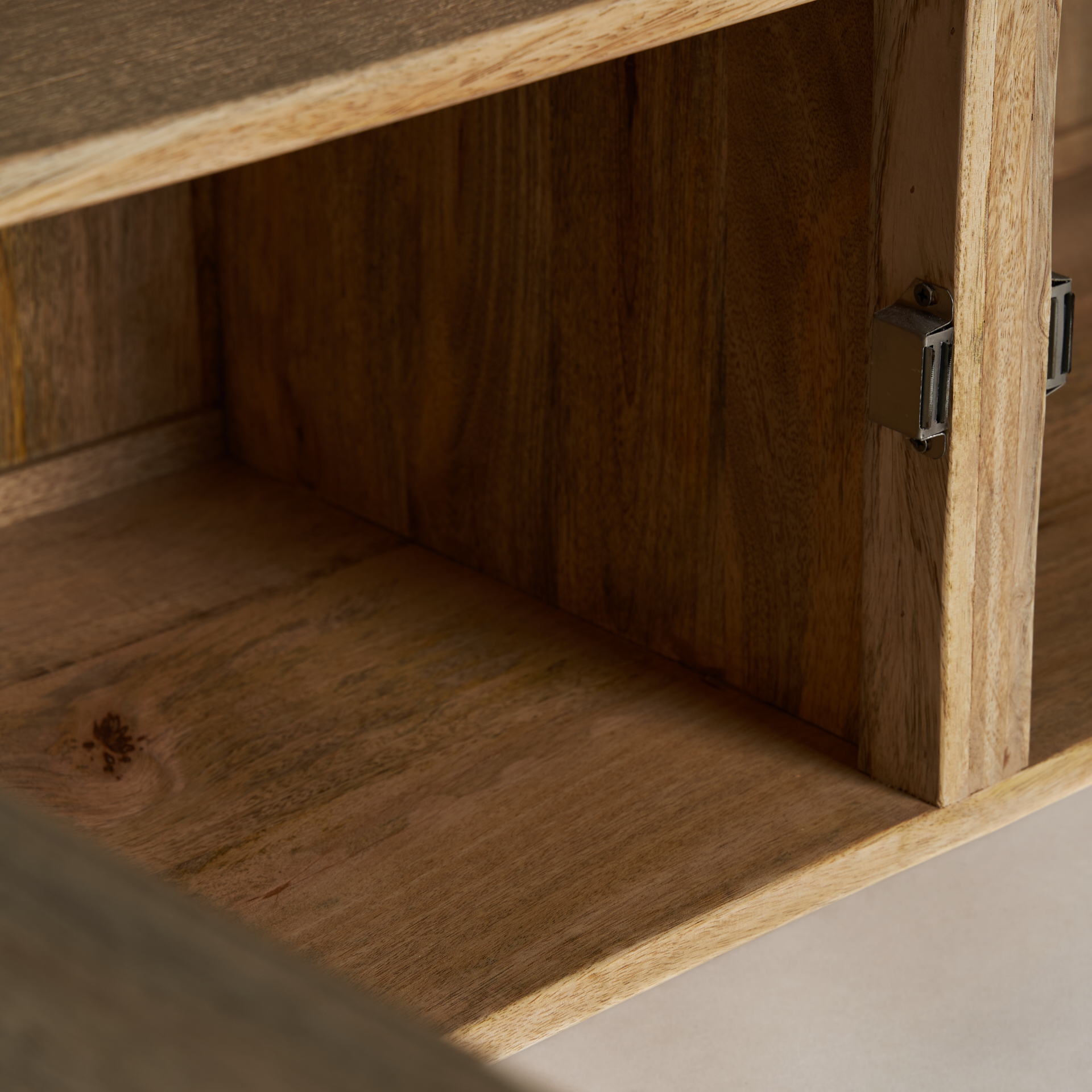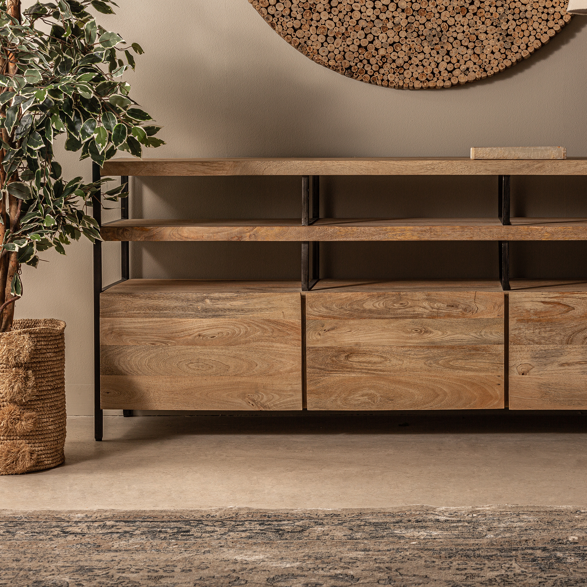 Aparador celle, de estilo colonial. Fabricado en madera de mango, en color marrón claro, combinado con hierro.