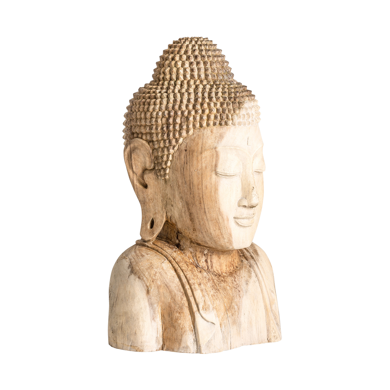 Busto budha, en color marrón, de estilo étnico. Fabricado en madera suar.