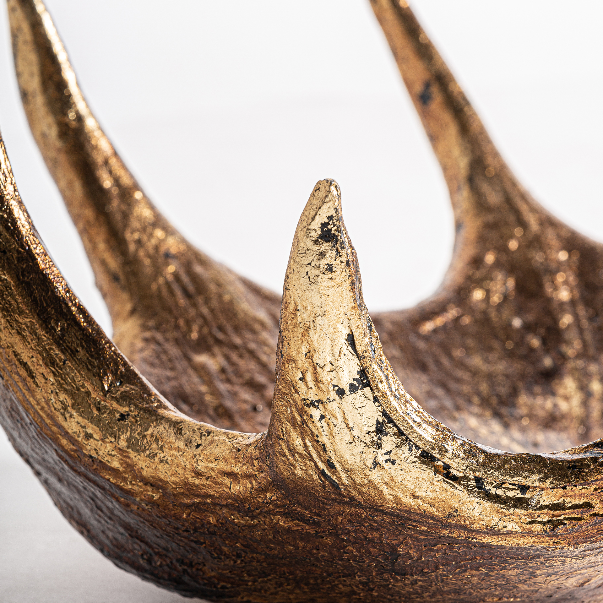 Centro de mesa cuerno, en color oro desgastado, de estilo clásico. Fabricado en resina.