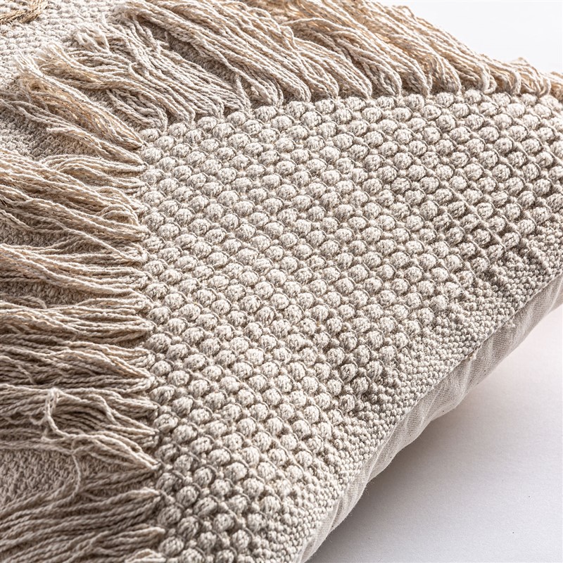 Cojín yaira, en color blanco/natural bordado, de estilo vintage. Fabricado en yute, combinado con algodón. Producto desenfundable.