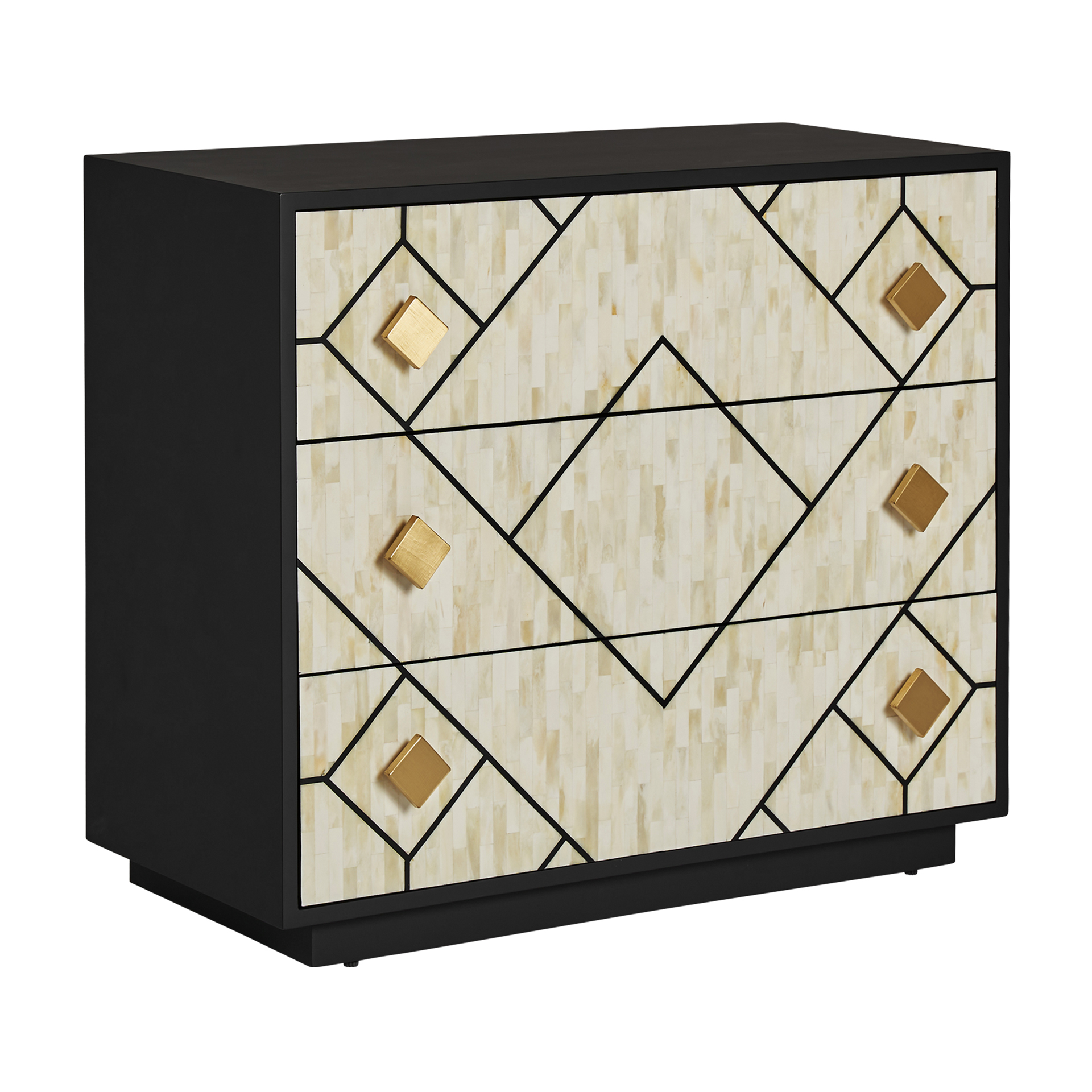 Cómoda charmes, de estilo art deco. Fabricado en madera dm, en color negro, combinado con hueso, en color blanco, en color oro.