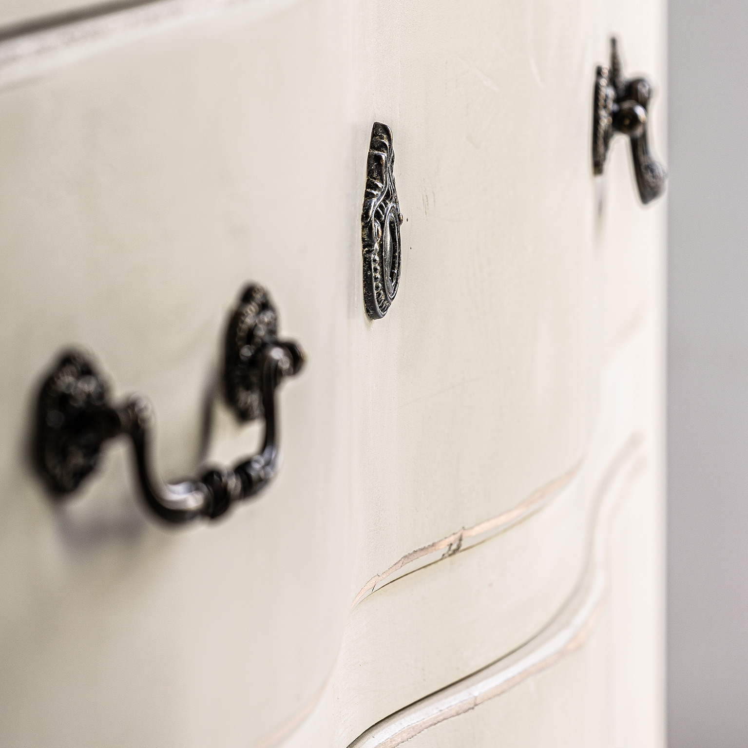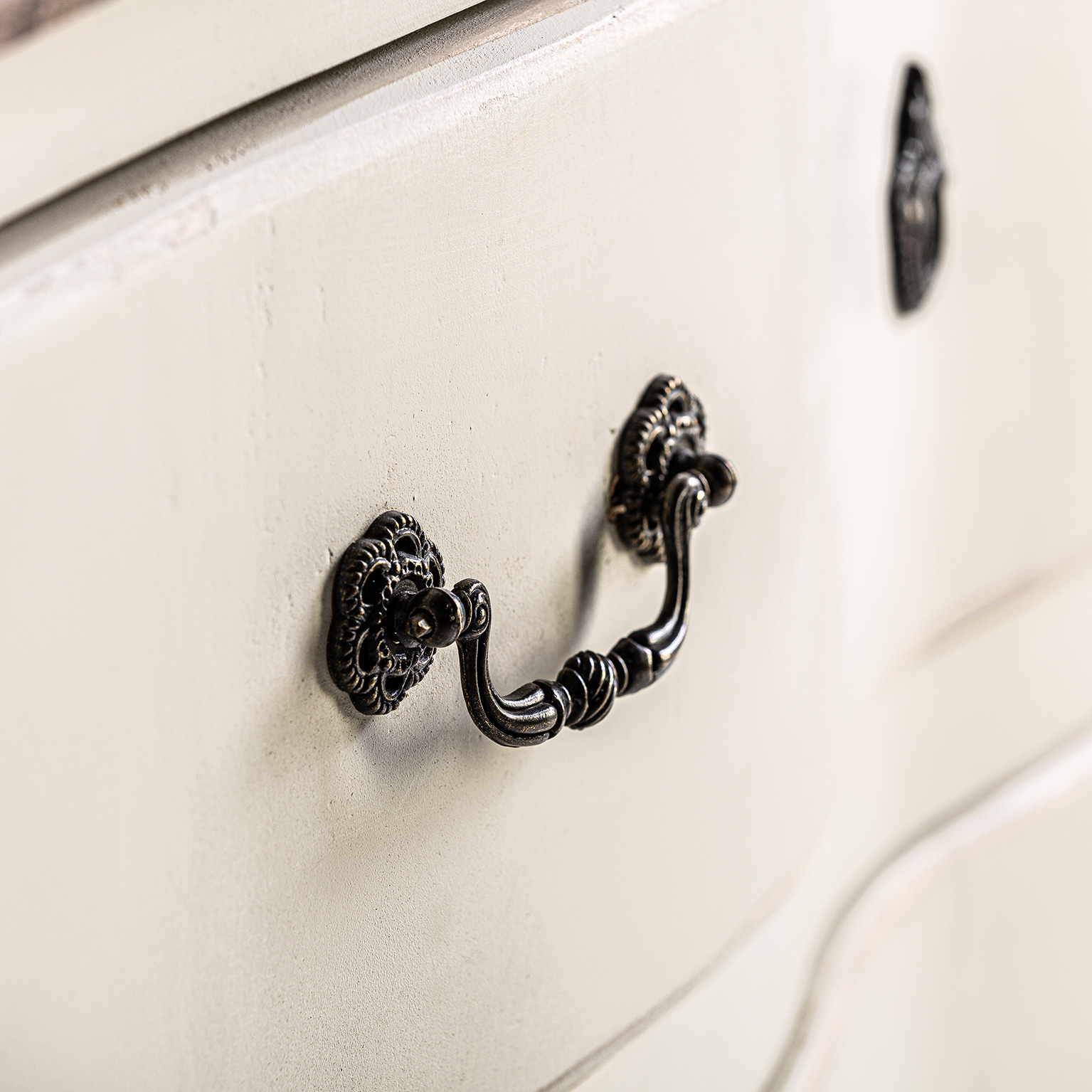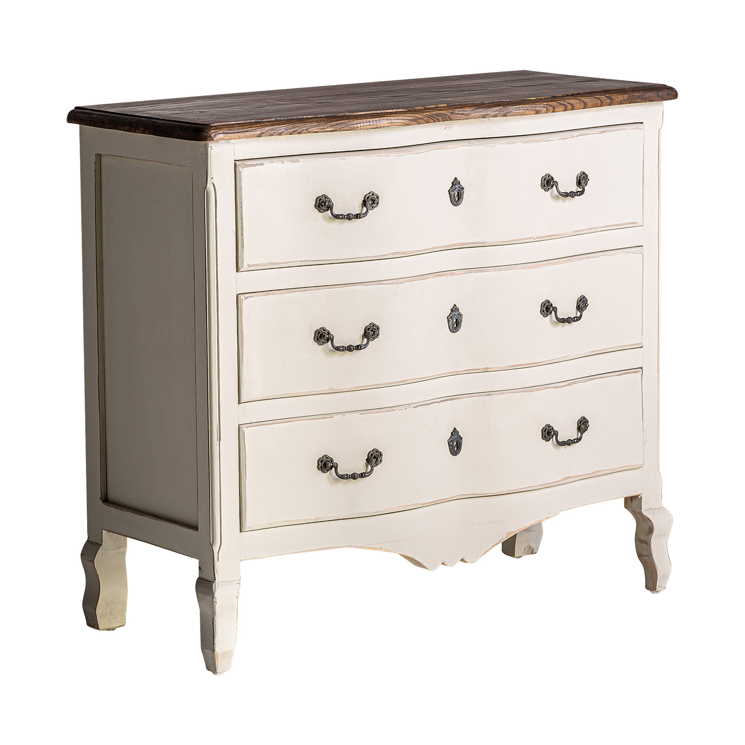 Cómoda pivka, de estilo provenzal. Fabricado en madera de olmo, en color blanco roto envejecido.