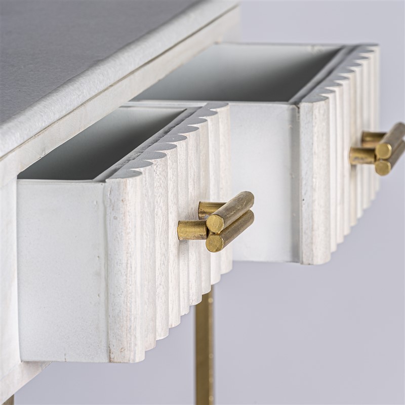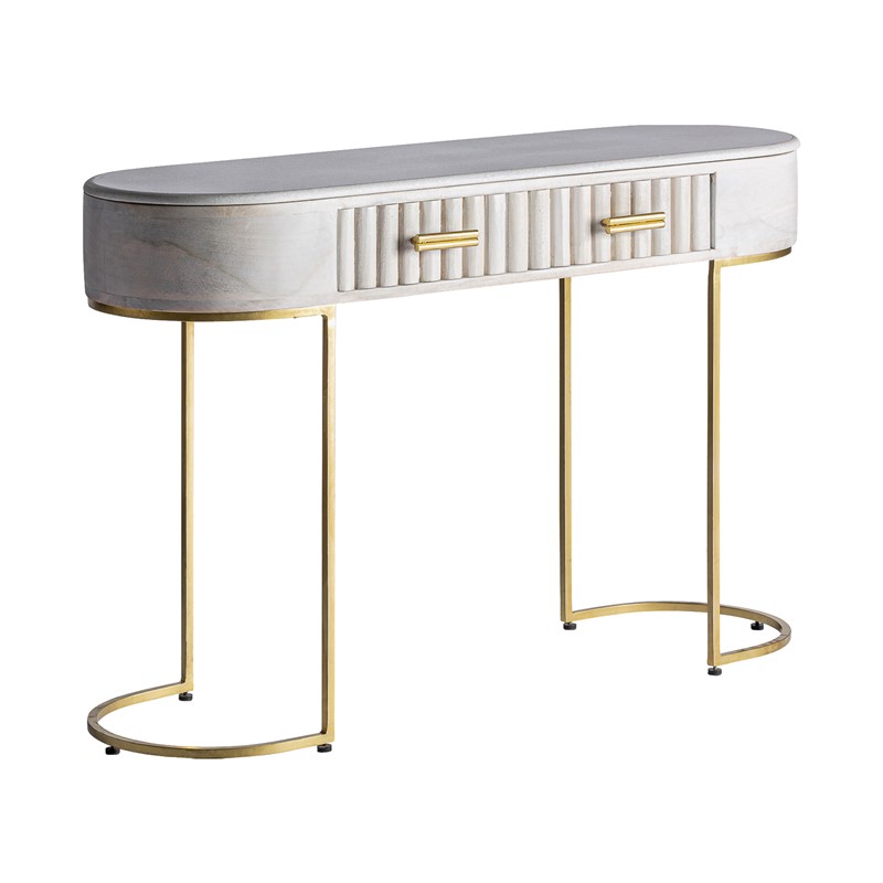 Consola glees, de estilo art deco. Fabricado en madera de mango, en color crema, combinado con hierro, en color oro y latón. Producto desmontable.