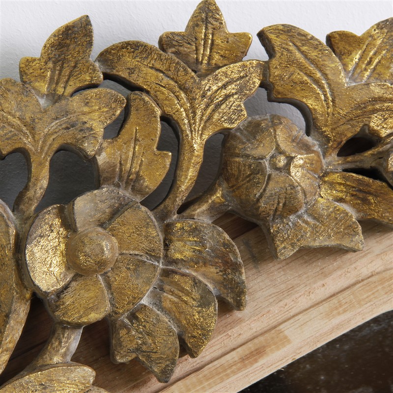 Espejo rectangular, en color marrón/oro tallado, de estilo colonial. Fabricado en madera de teka, combinado con vidrio.