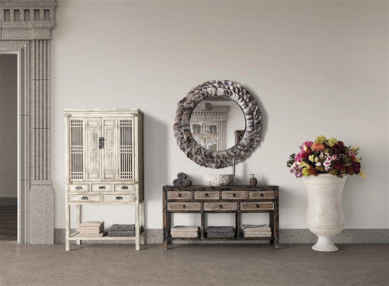 Espejo Inga de estilo nórdico, fabricado en acero en color marfil, combinado con concha y espejo. Concha de ostra.