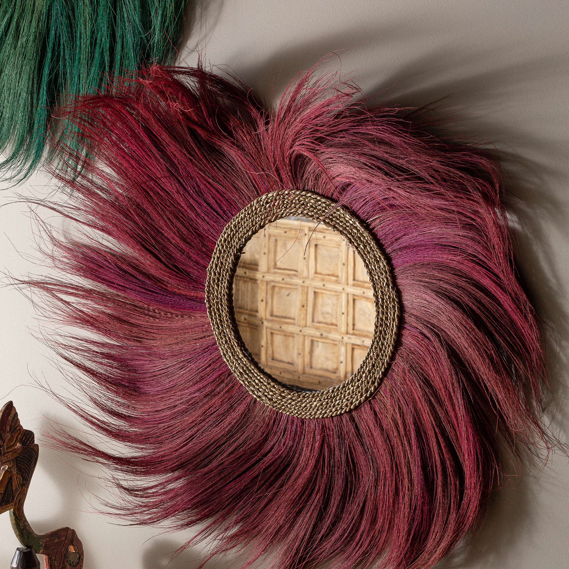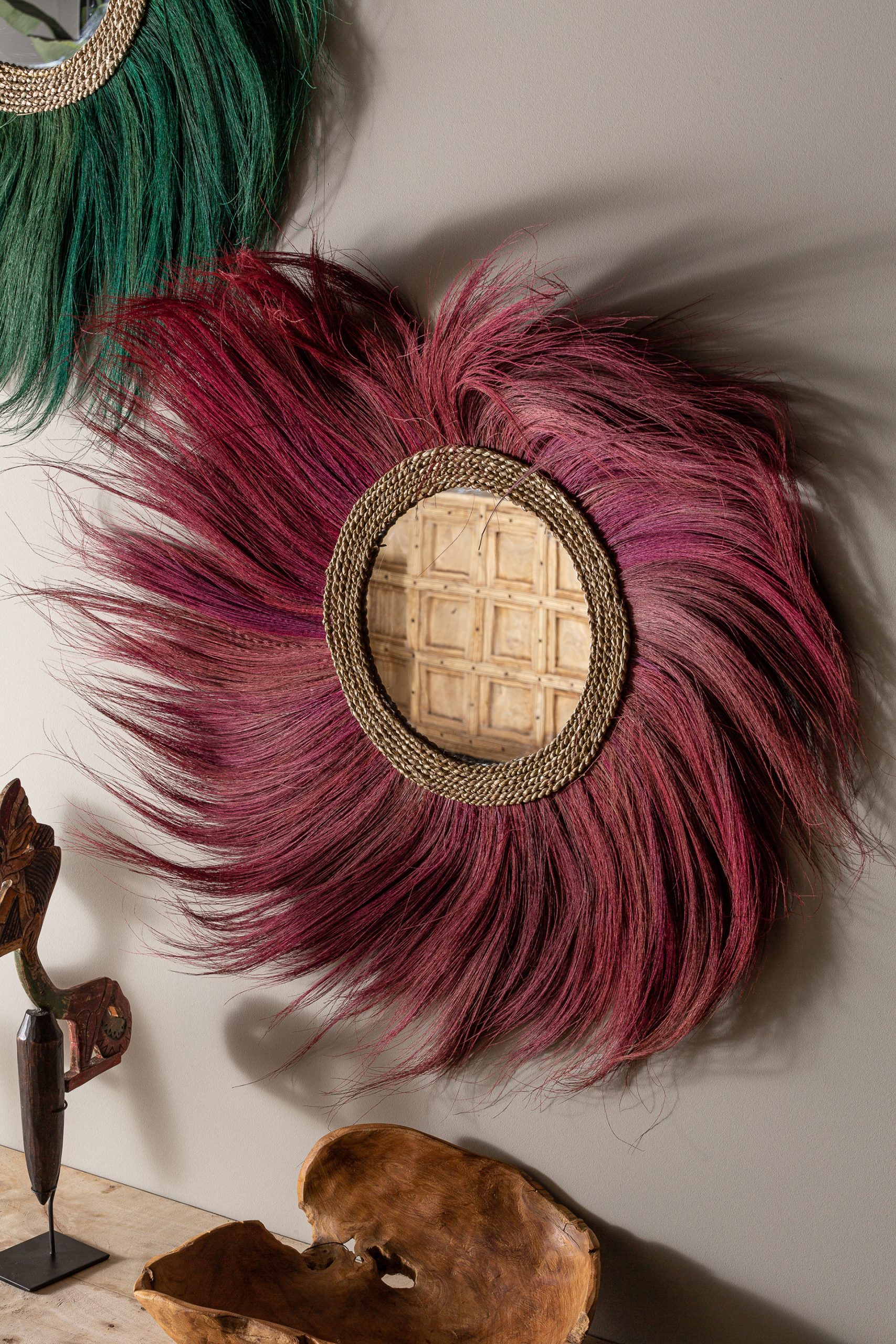 Espejo sinko, en color rojo, de estilo étnico. Fabricado en fibra natural, combinado con espejo.