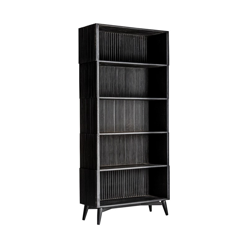 Estanteria Plissé Wood, en color Negro, de Estilo Art Deco.Fabricado en Madera de Mango, Combinado Con Hierro.Patas de Hierro Con Acabado Imitando A Madera.