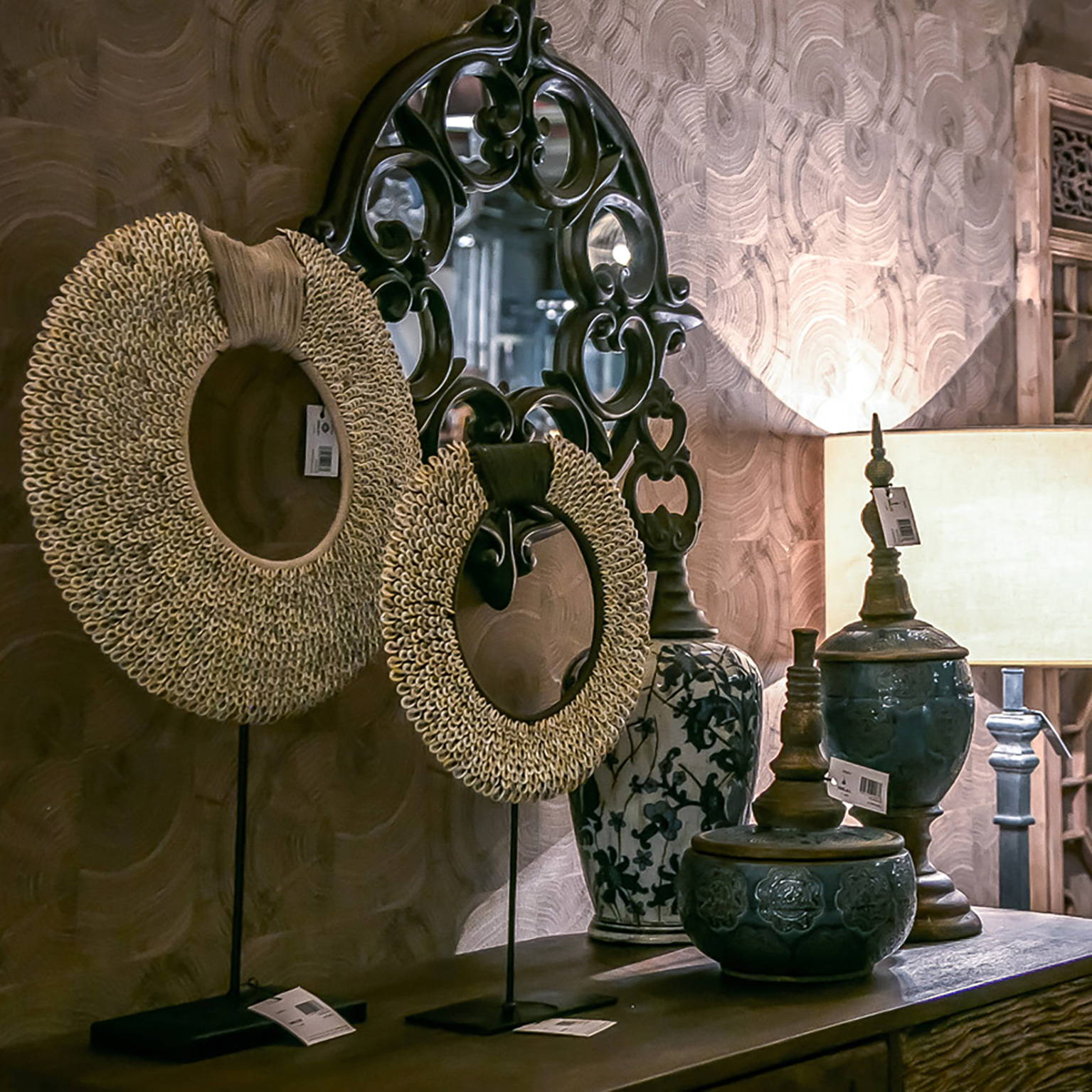 Figura decorativa collar conchas, en color marrón, de estilo étnico. Fabricado en resina, combinado con concha y hierro. Fibra natural.