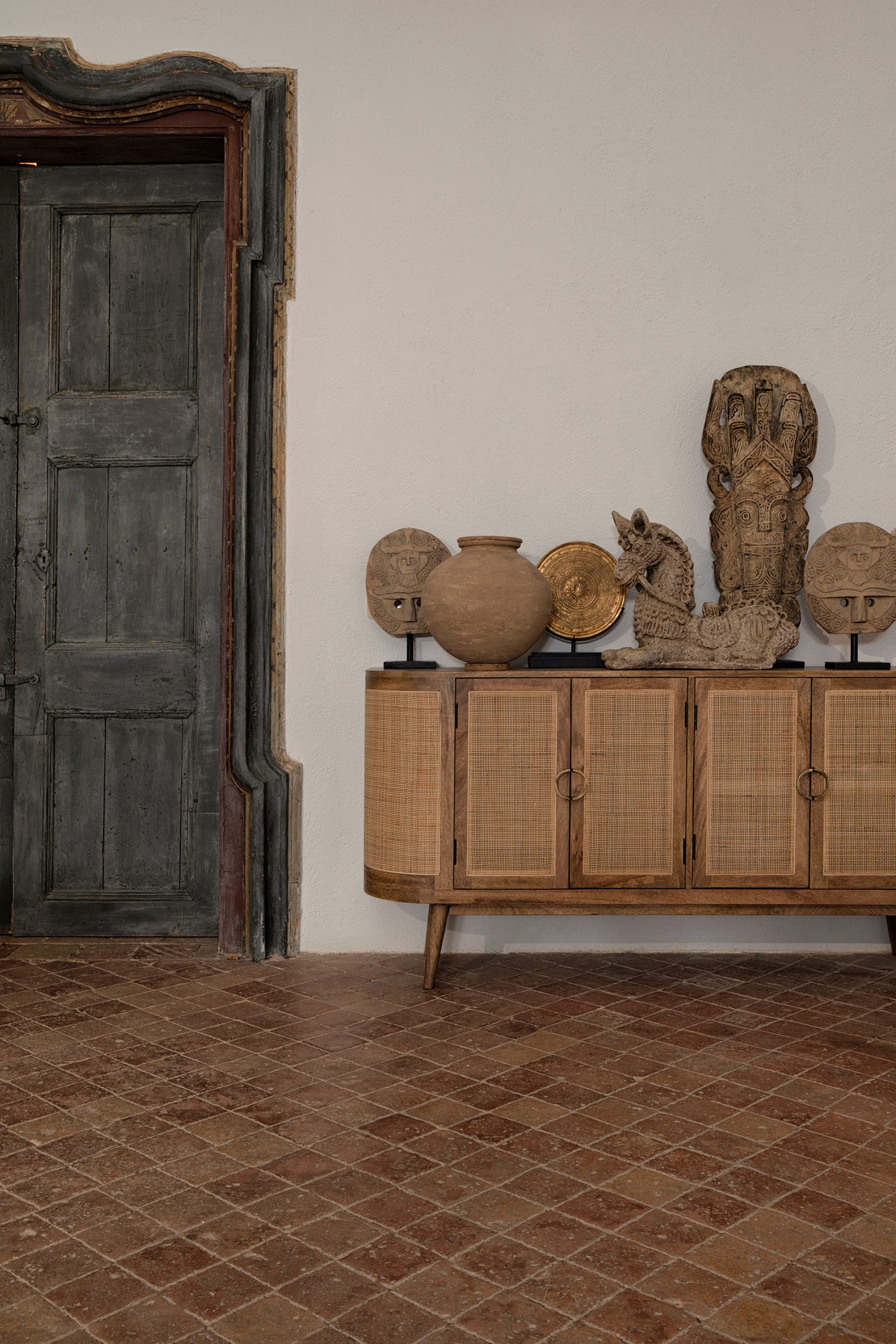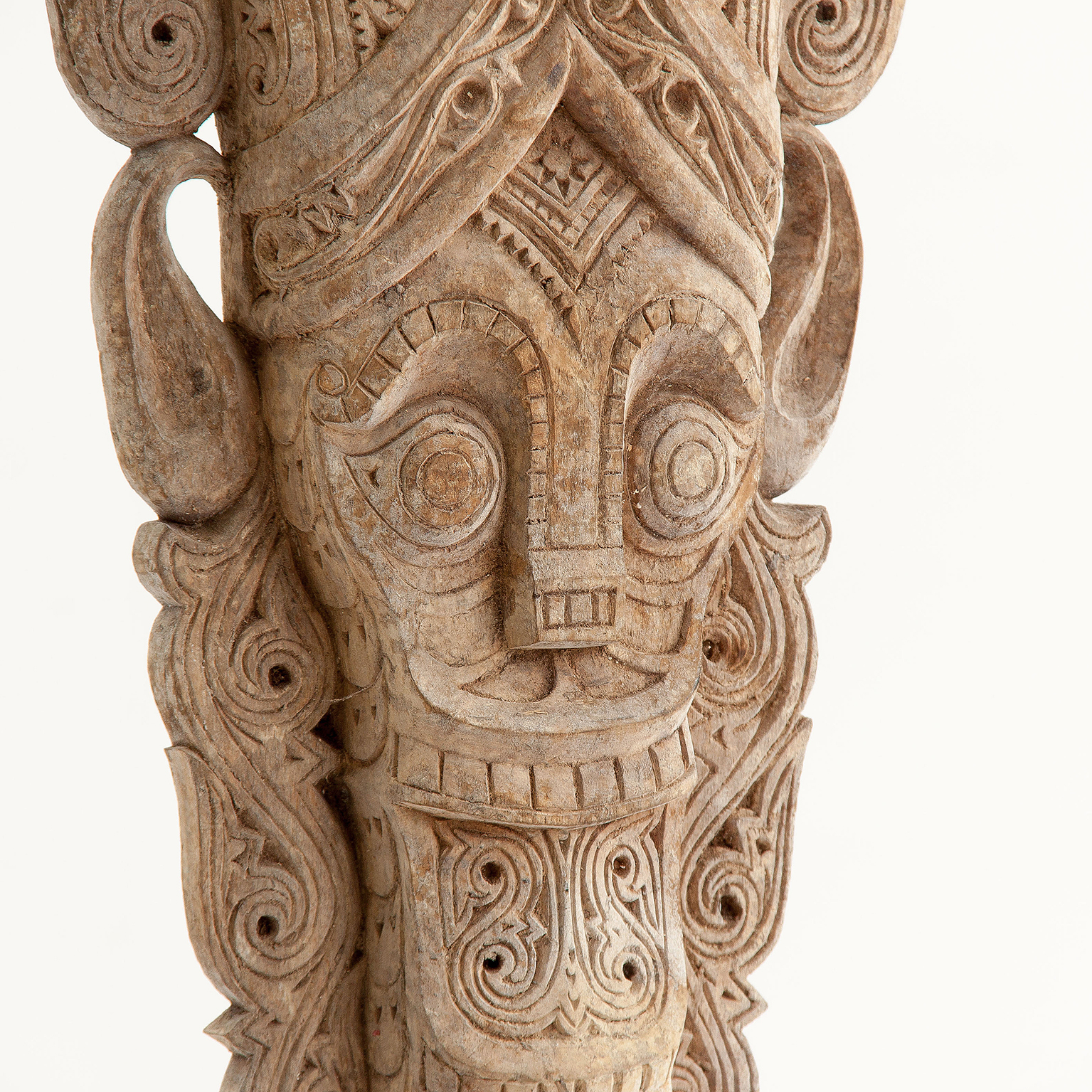 Figura decorativa máscara, en color marrón envejecido, de estilo étnico. Fabricado en madera, combinado con hierro.