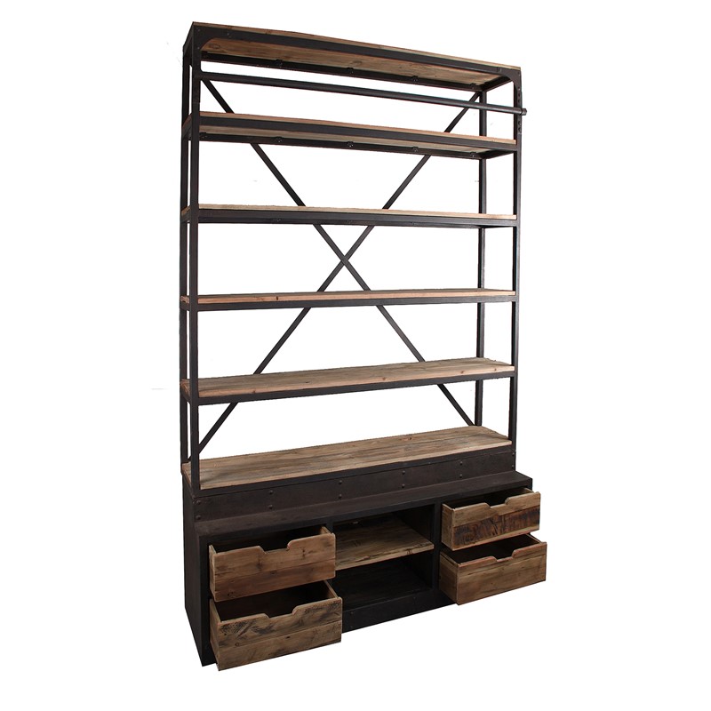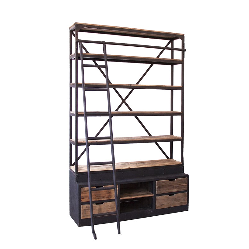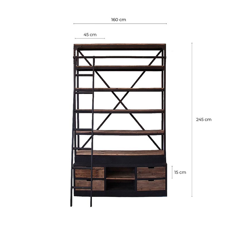 Librería ivalo, de estilo industrial. Fabricado en madera de pino reciclado, en color negro, combinado con hierro, en color natural. Producto desmontable.