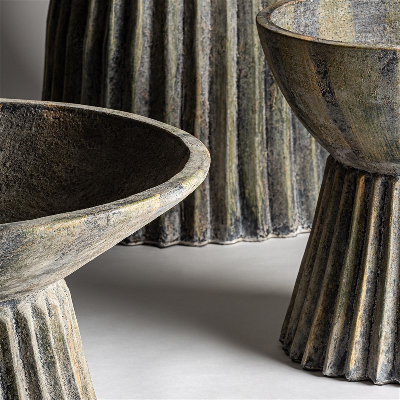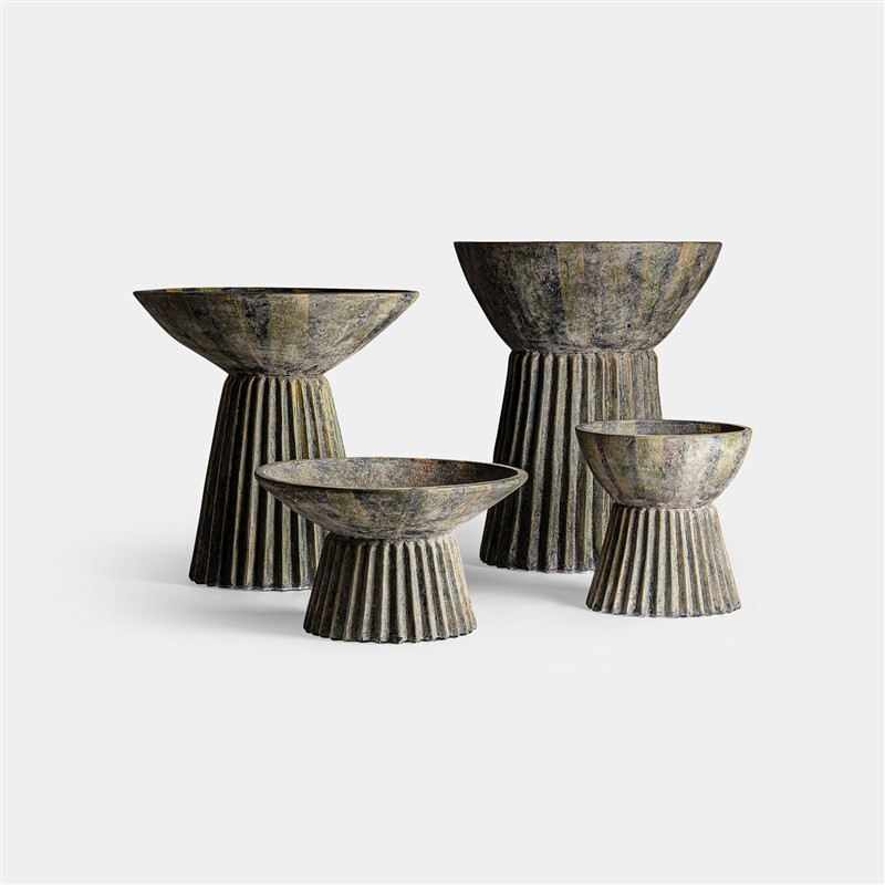 Macetero plissé stone, en color gris envejecido, de estilo art deco. Fabricado en cemento, combinado con fibra de vidrio.