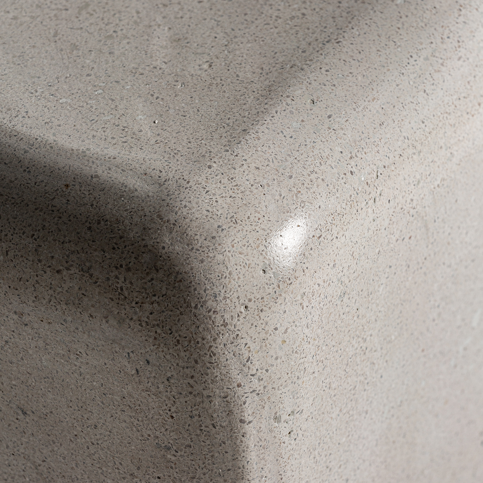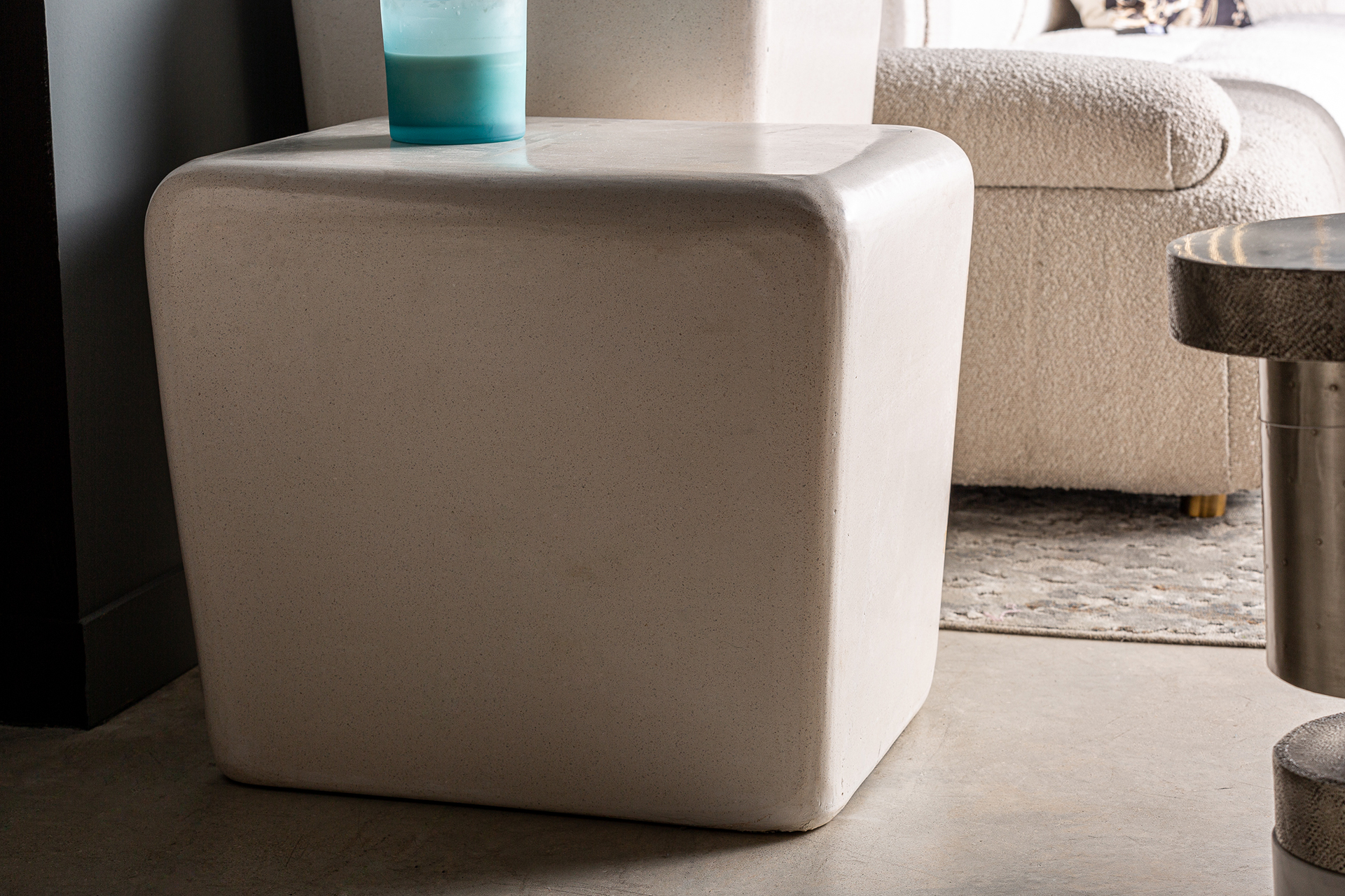 Mesa auxiliar vasto, de estilo contemporáneo. Fabricado en piedra, en color blanco.