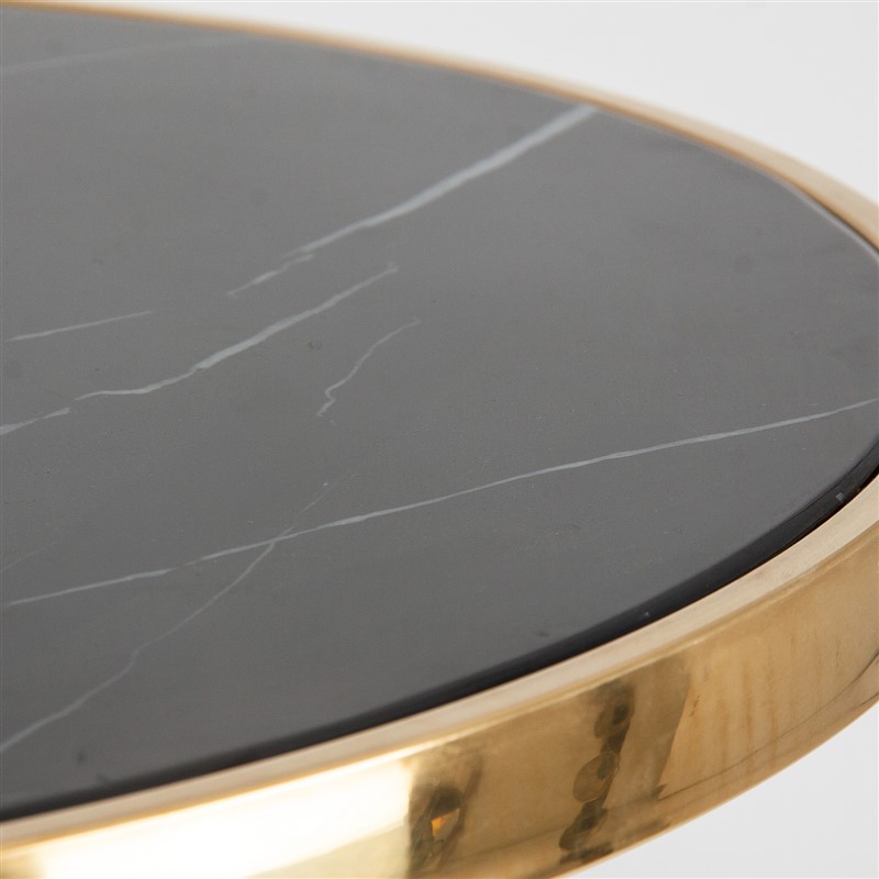 Mesa bar than, de estilo art deco. Fabricado en hierro, en color negro brillo, combinado con mármol sintético, en color oro y acero. Producto desmontable.