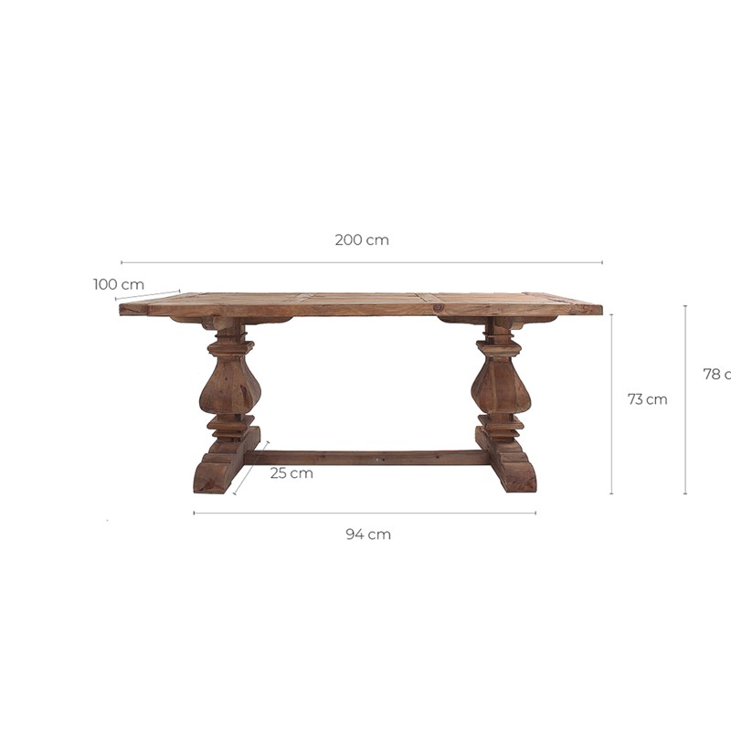 Mesa comedor abo, de estilo rústico. Fabricado en madera de pino reciclado, en color marrón envejecido. Producto desmontable.