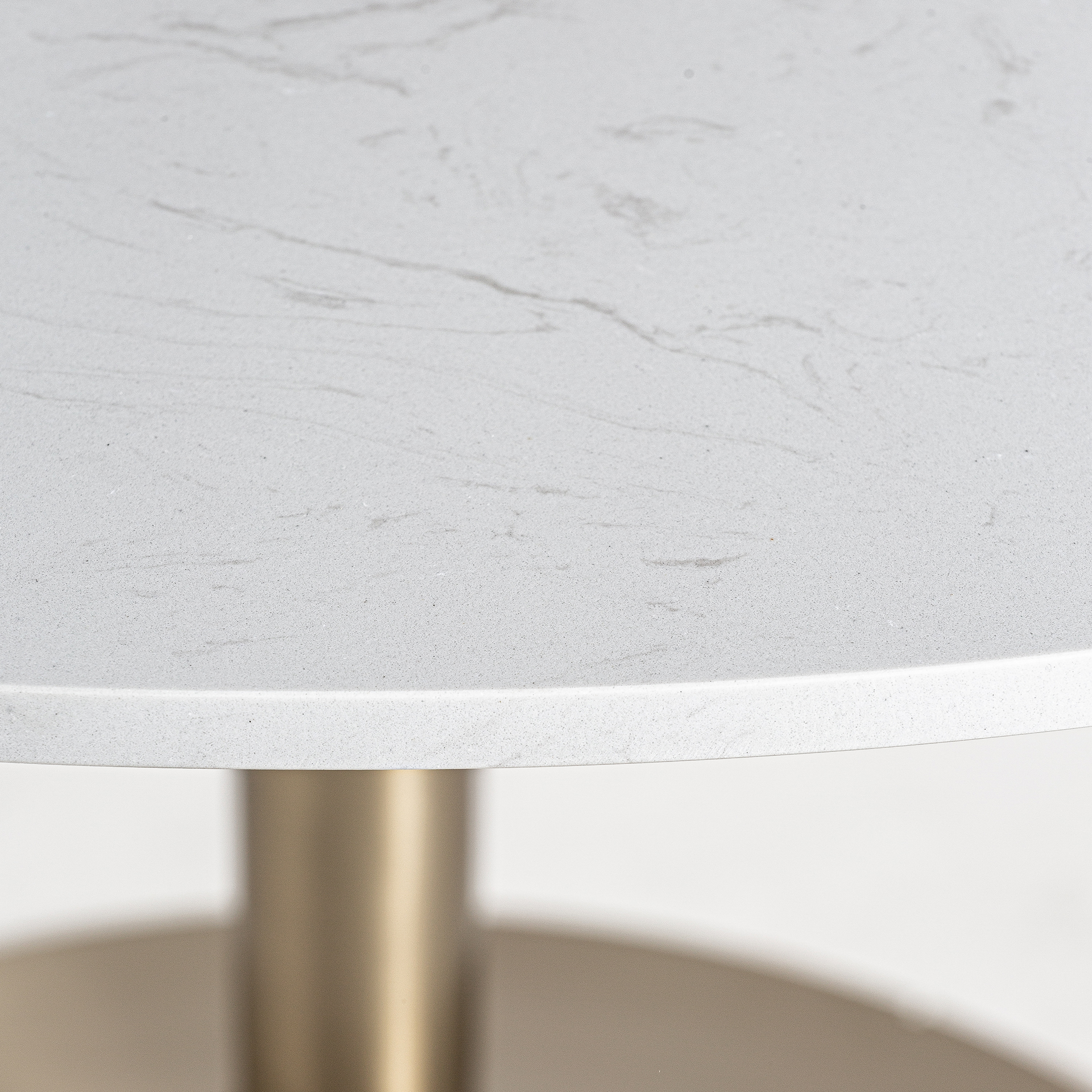 Mesa comedor kelheim, de estilo art deco. Fabricado en porcelánico, en color gris oro, combinado con acero, en color oro. Producto desmontable.