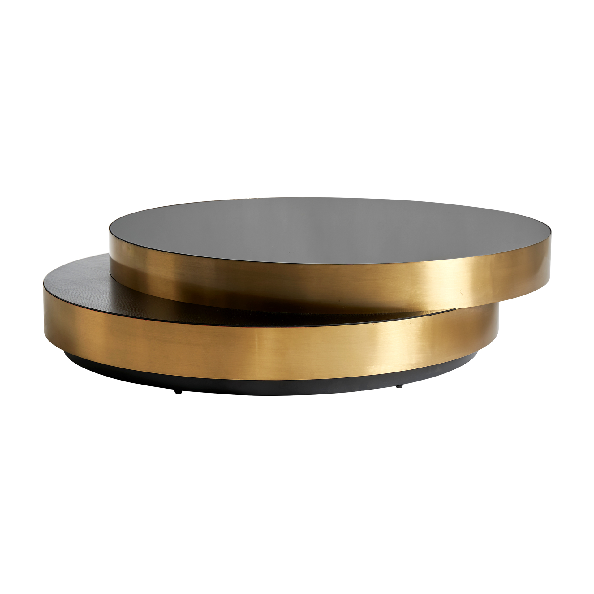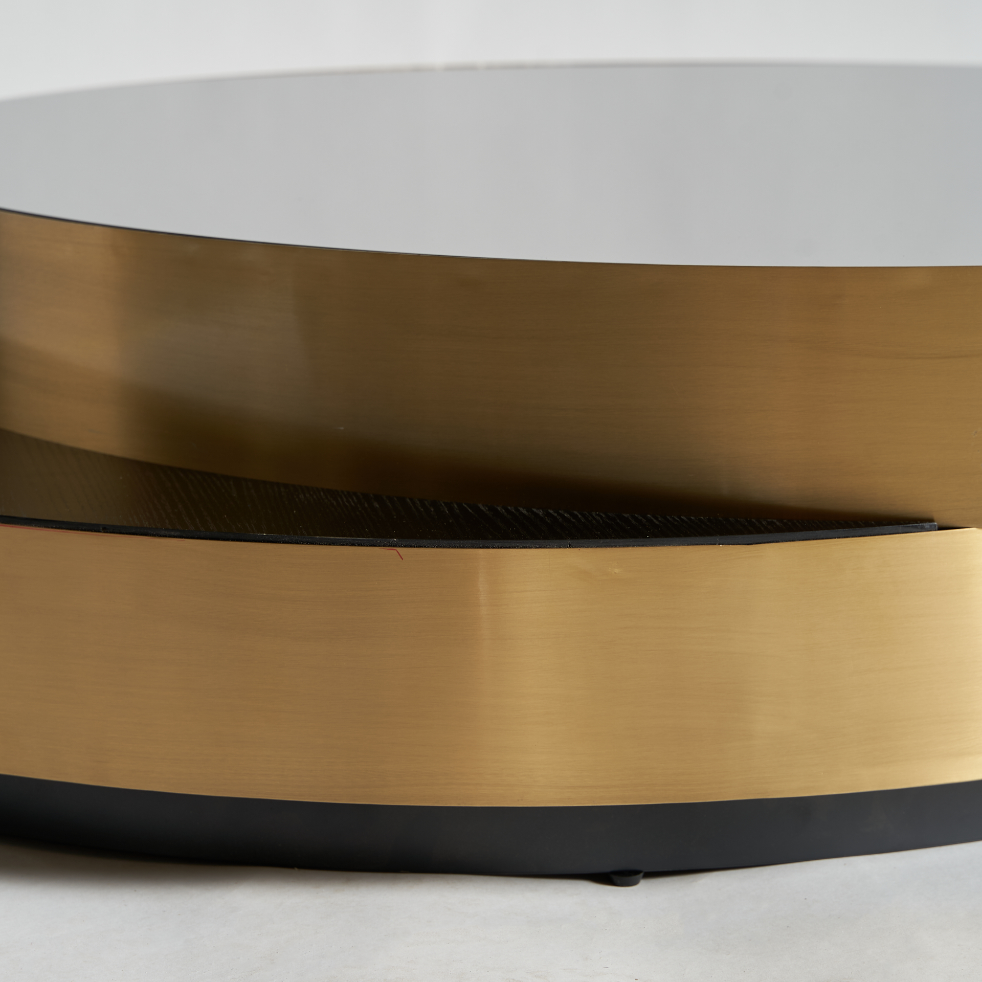 Mesa de centro grein, de estilo art deco. Fabricado en acero, en color negro, combinado con vidrio, en color oro y madera. Producto desmontable.