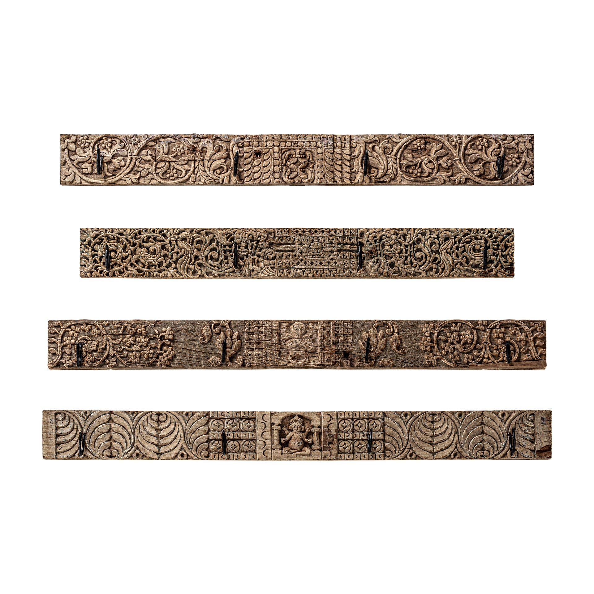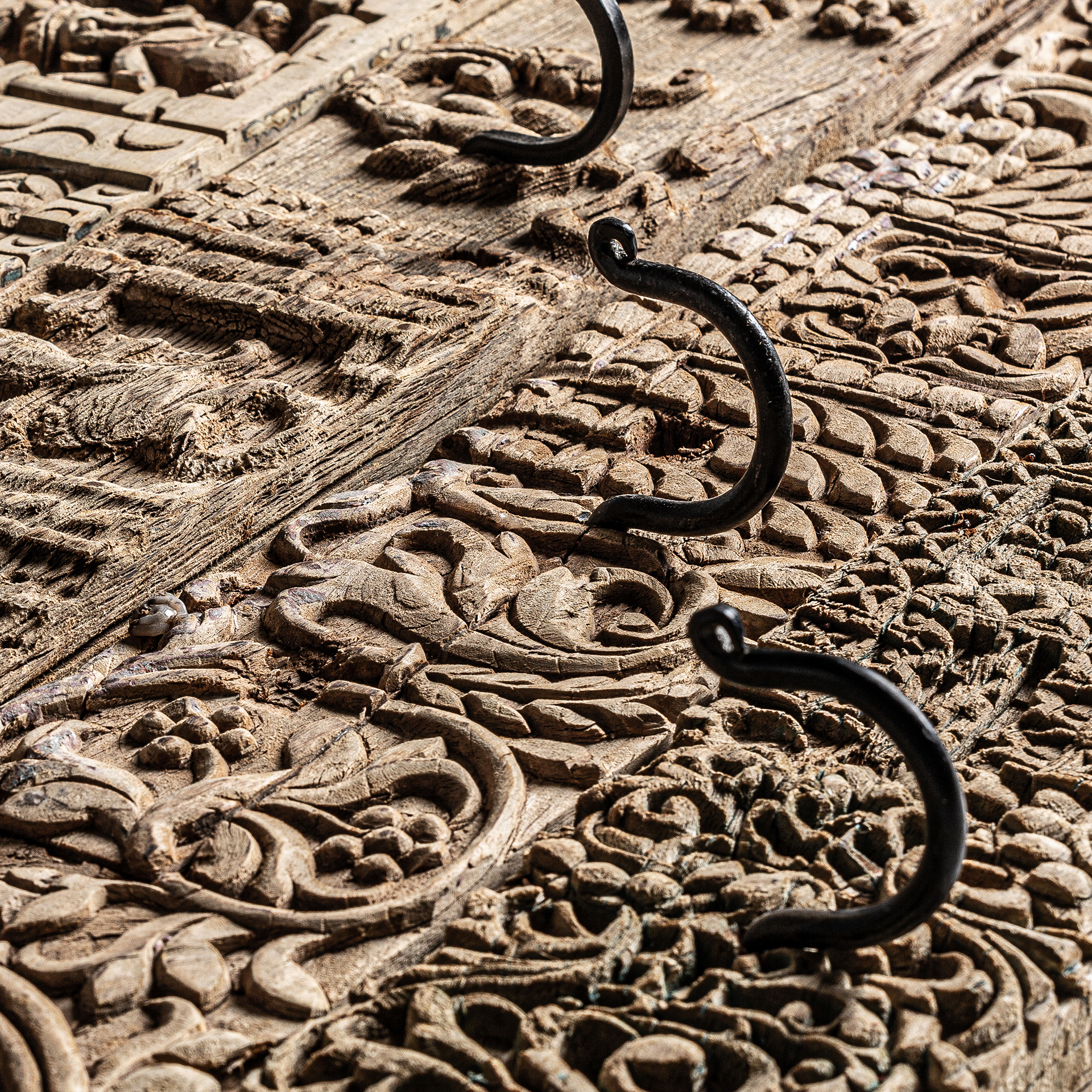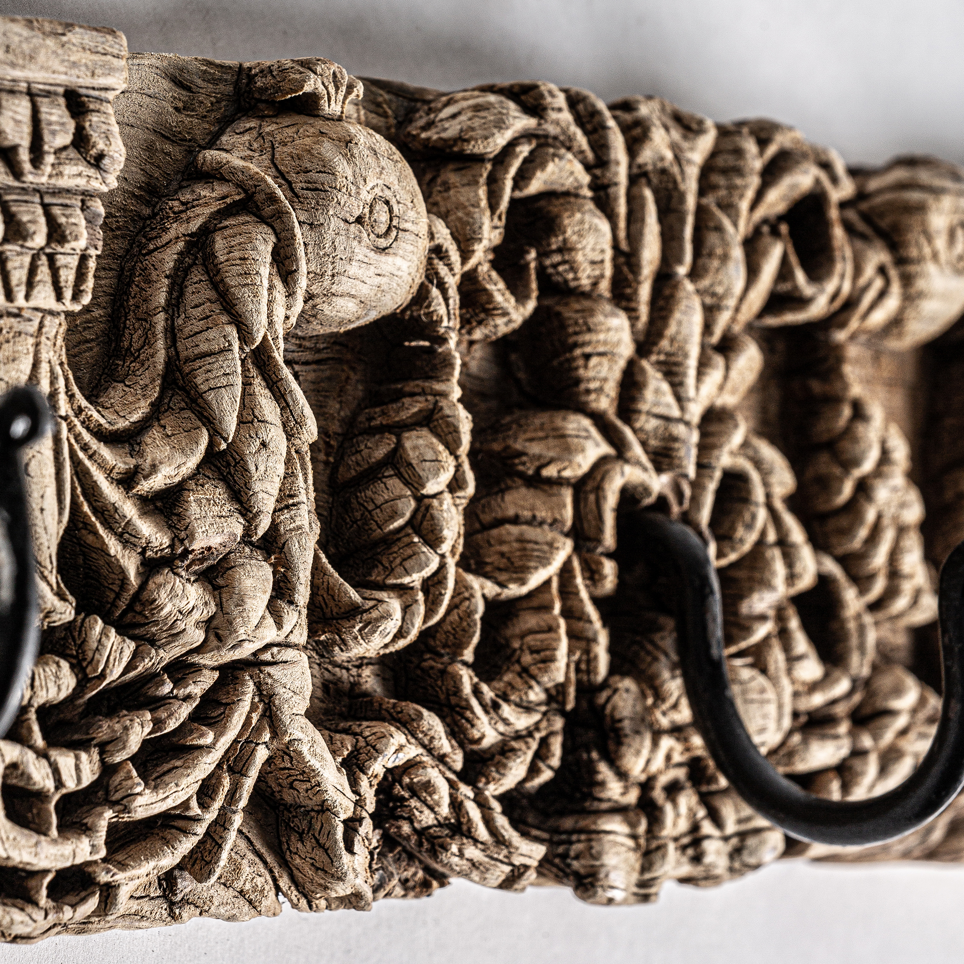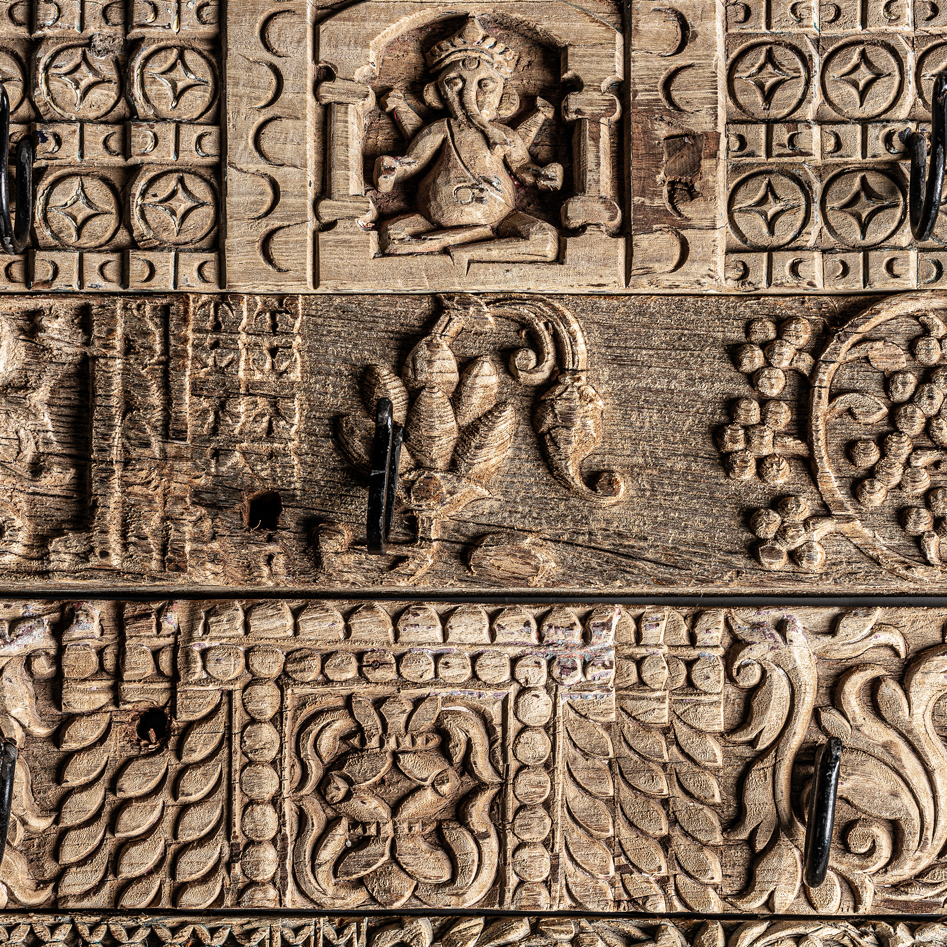 Percha Askale de estilo étnico, fabricado en madera de teka en color marrón con acabado tallado, combinado con hierro en color negro.