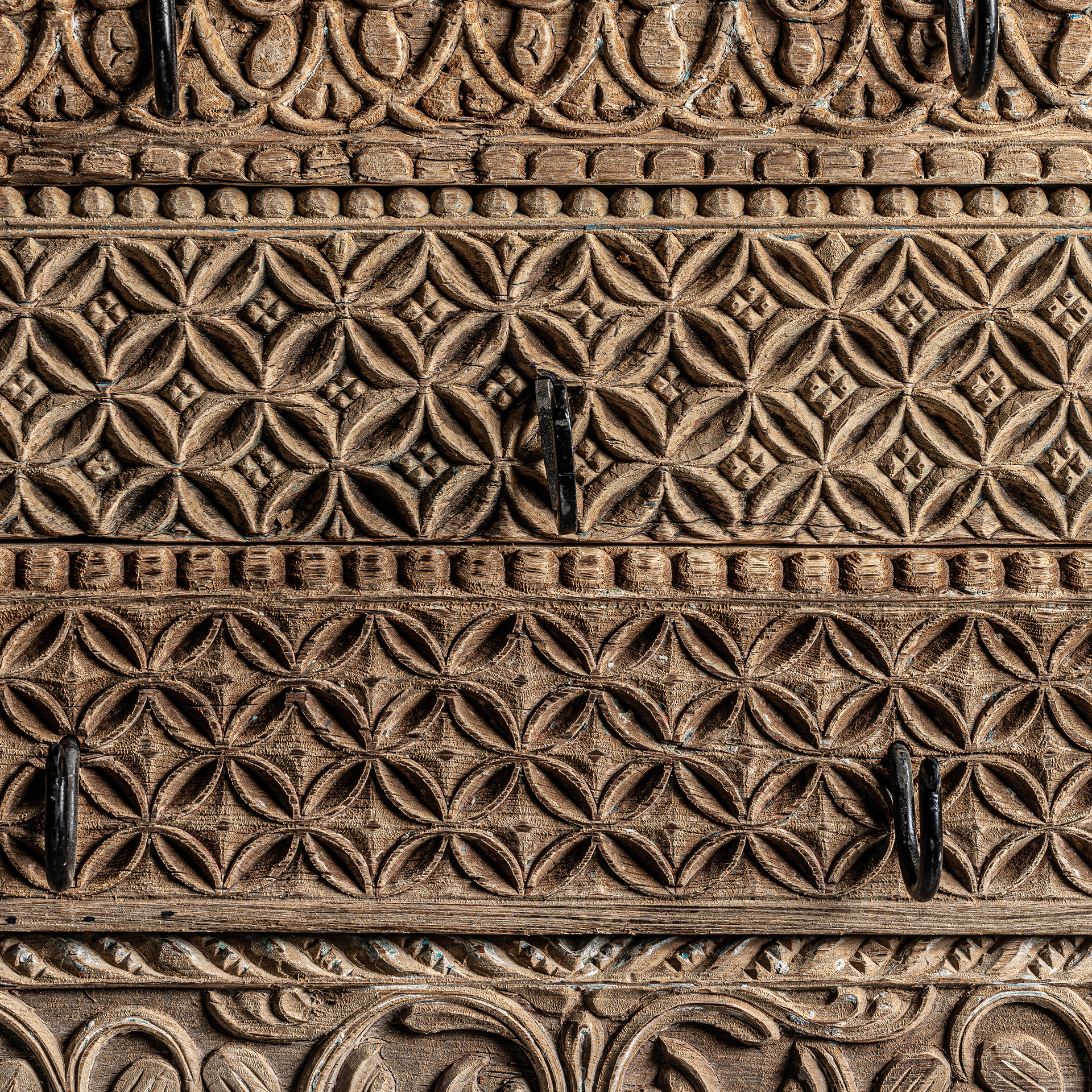 Percha surtido cain, de estilo étnico. Fabricado en madera de teka, en color marrón, combinado con hierro.