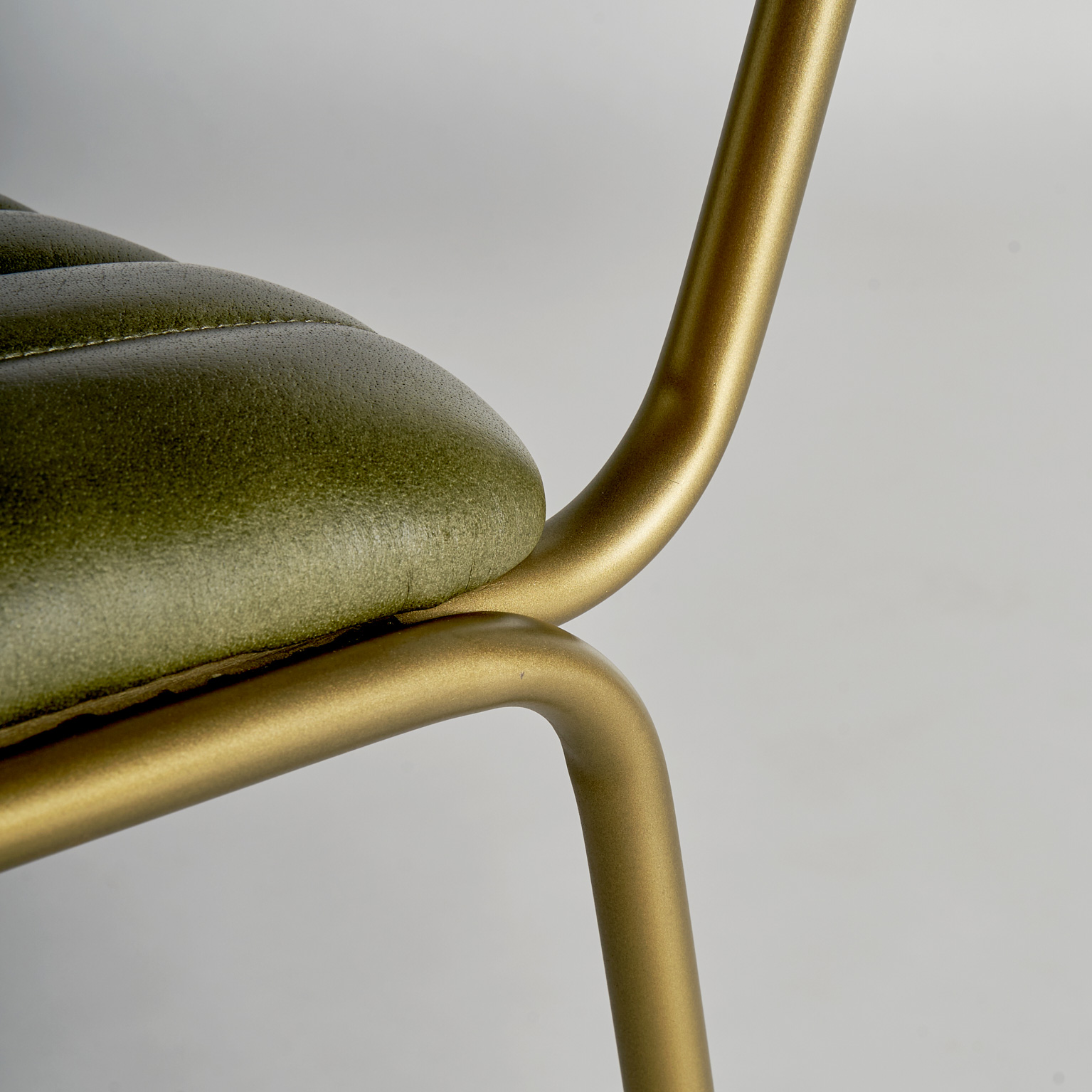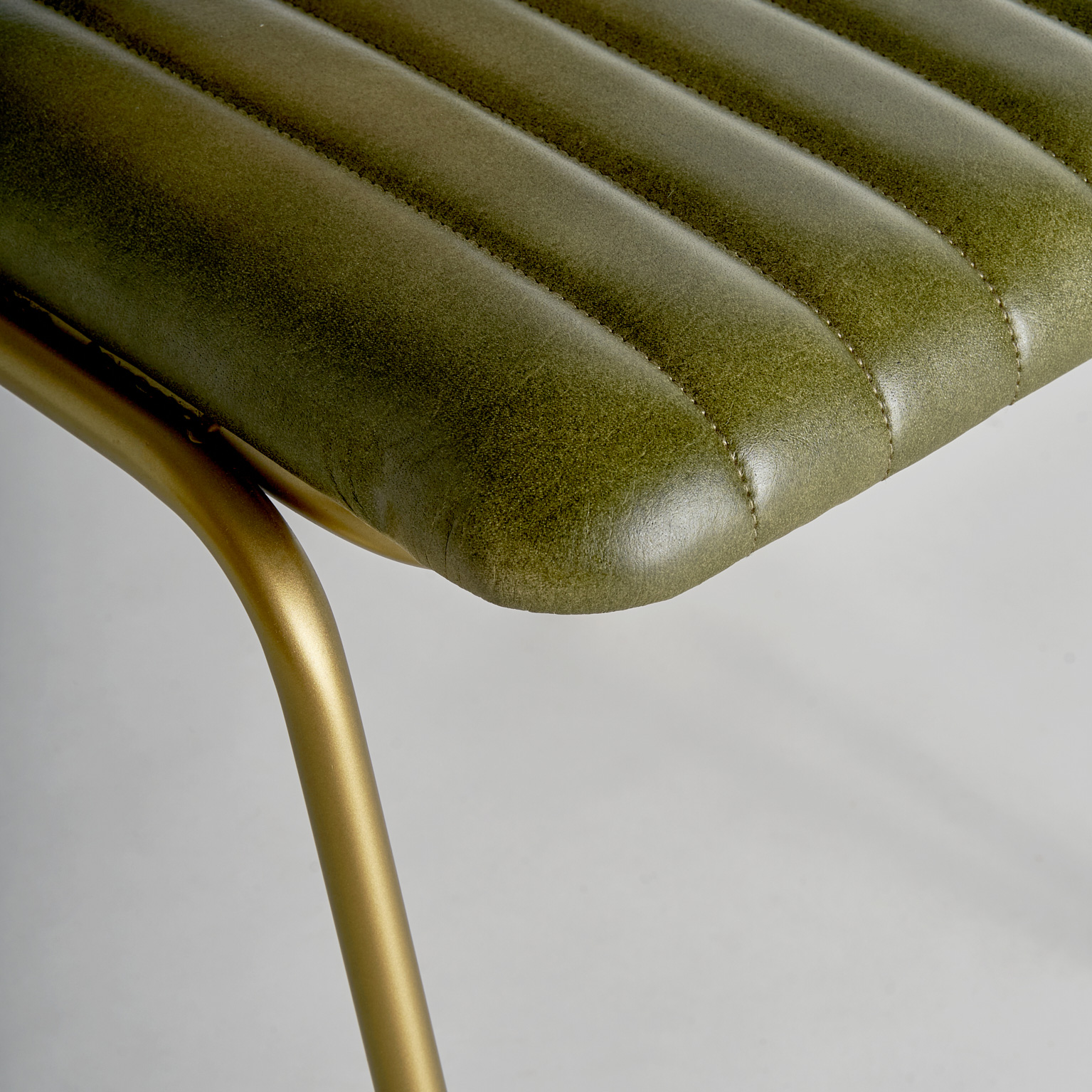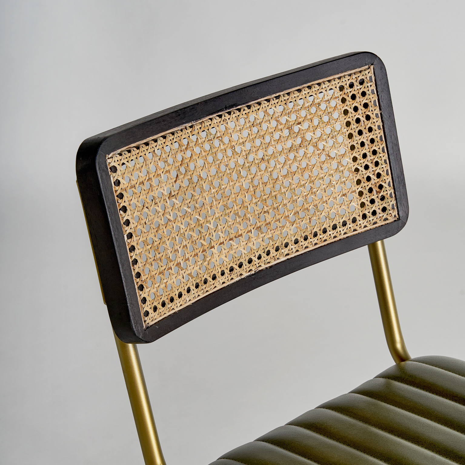 Silla Almstock de estilo vintage, fabricado en cuero en color verde, combinado con hierro en color oro y ratán.