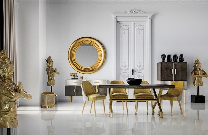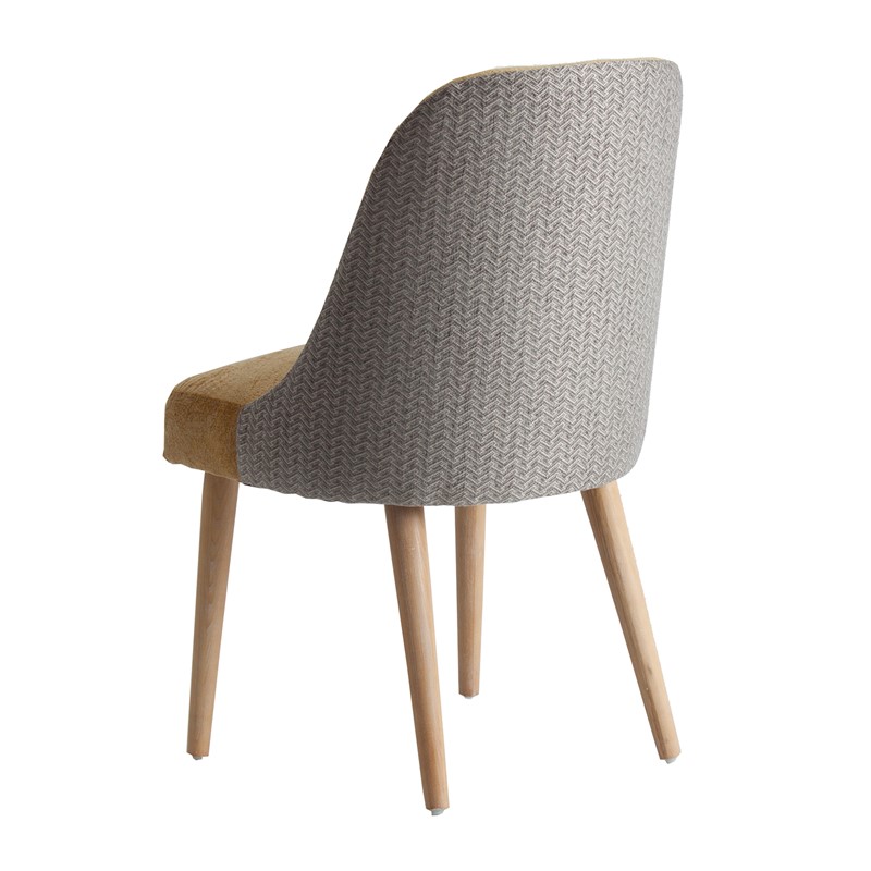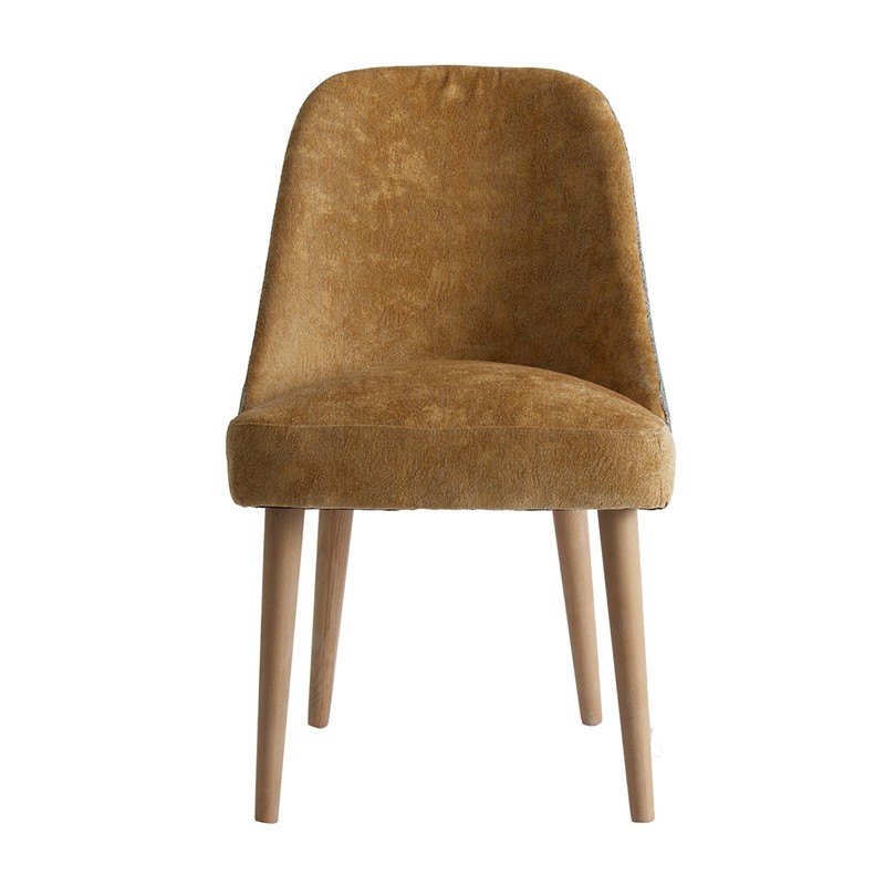 Silla lage, en color mostaza, de estilo kitsh. Fabricado en madera de abeto, combinado con poliéster y lino. Espuma. Producto desmontable.