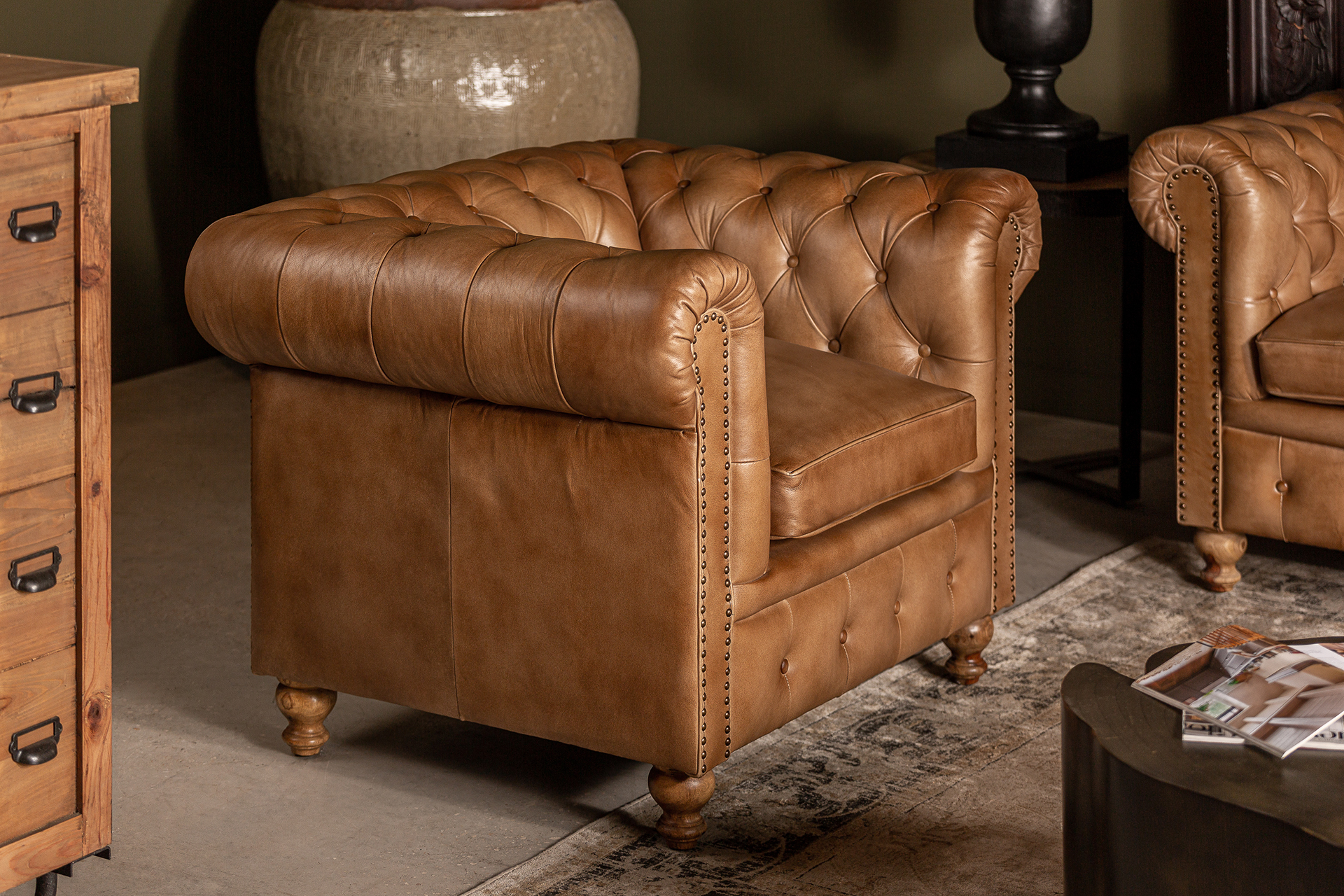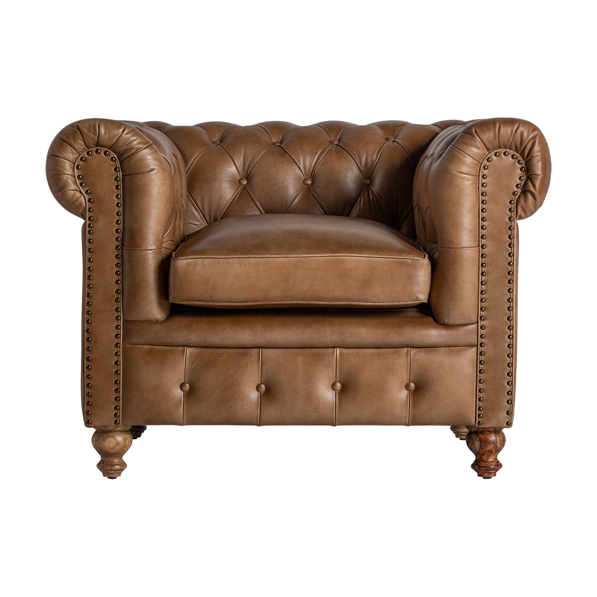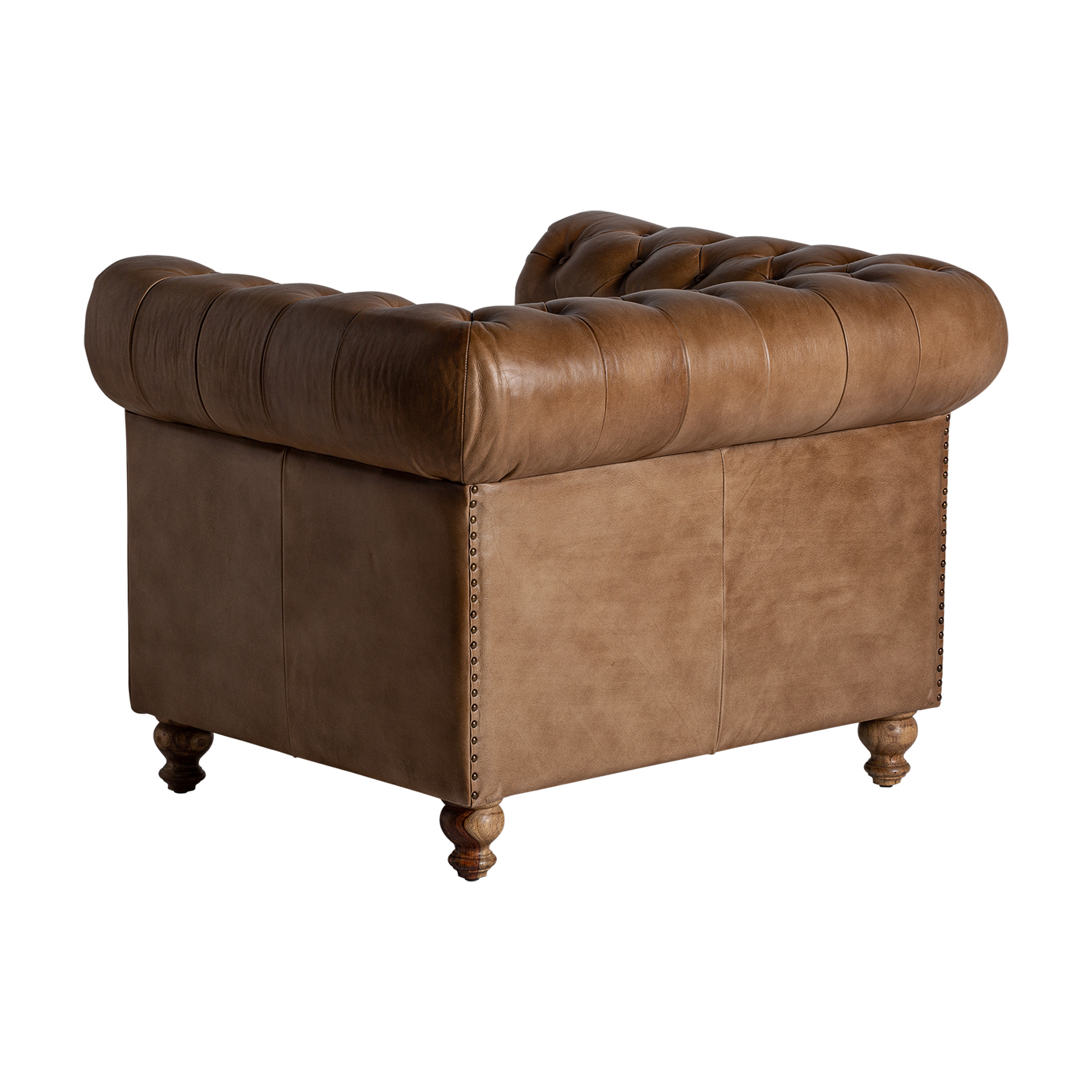 Sillón capitoné elkins, de estilo vintage. Fabricado en piel, en color marrón, combinado con madera de acacia. Producto desmontable.