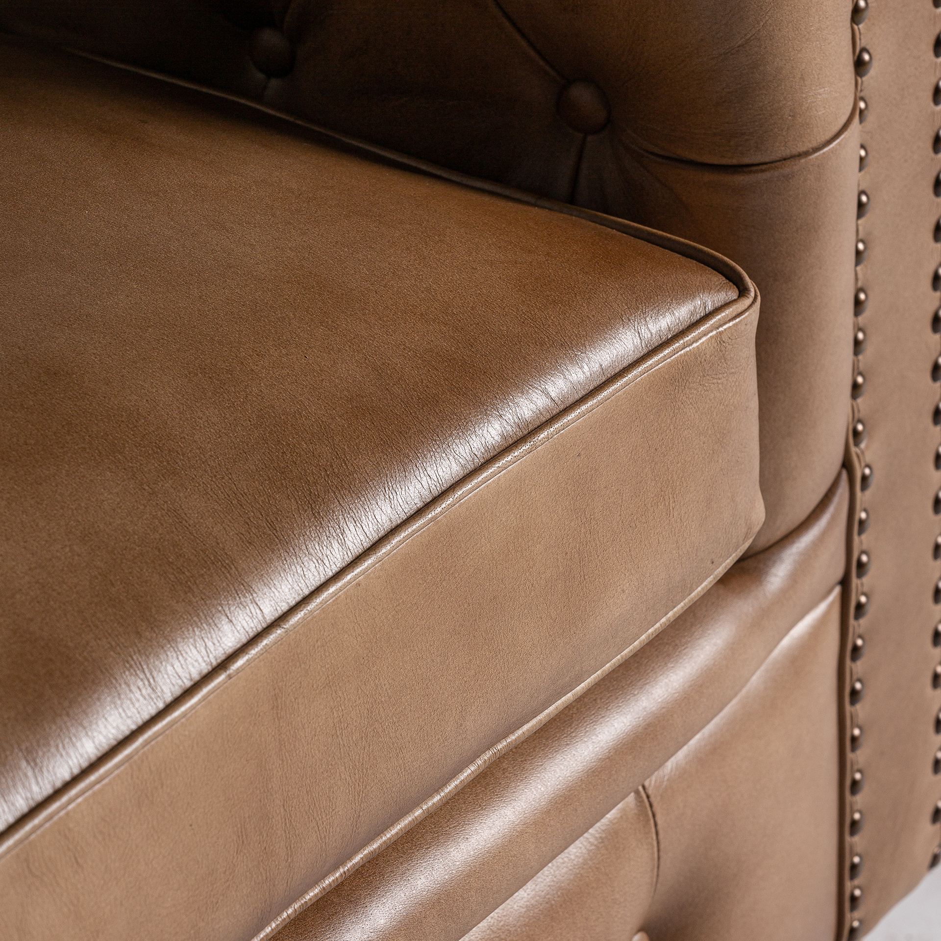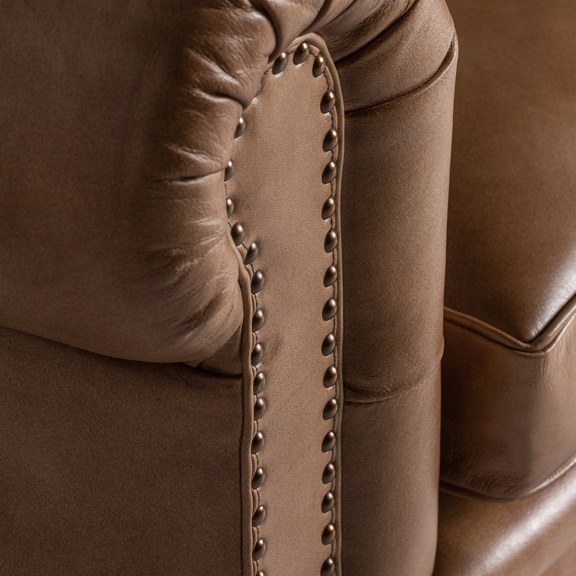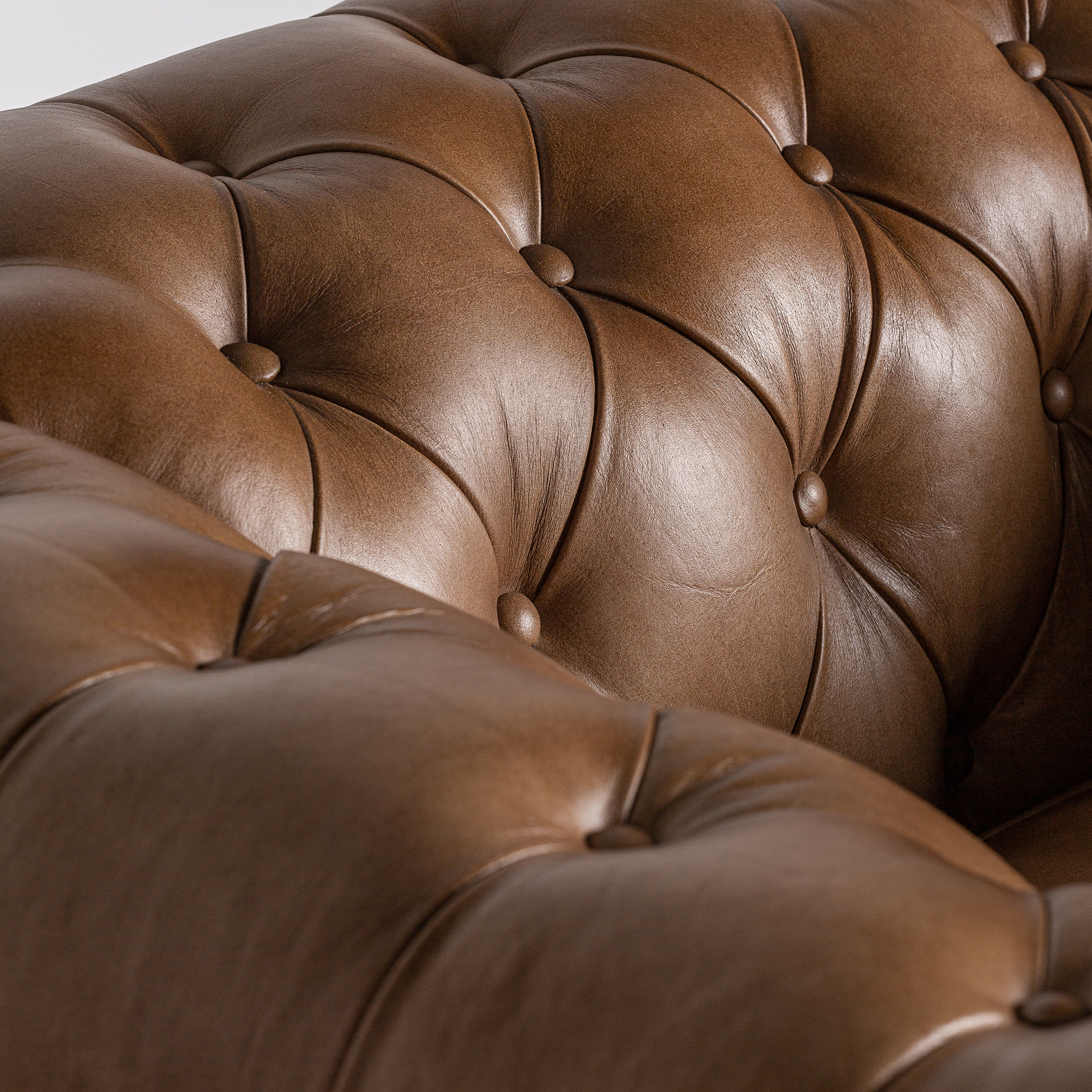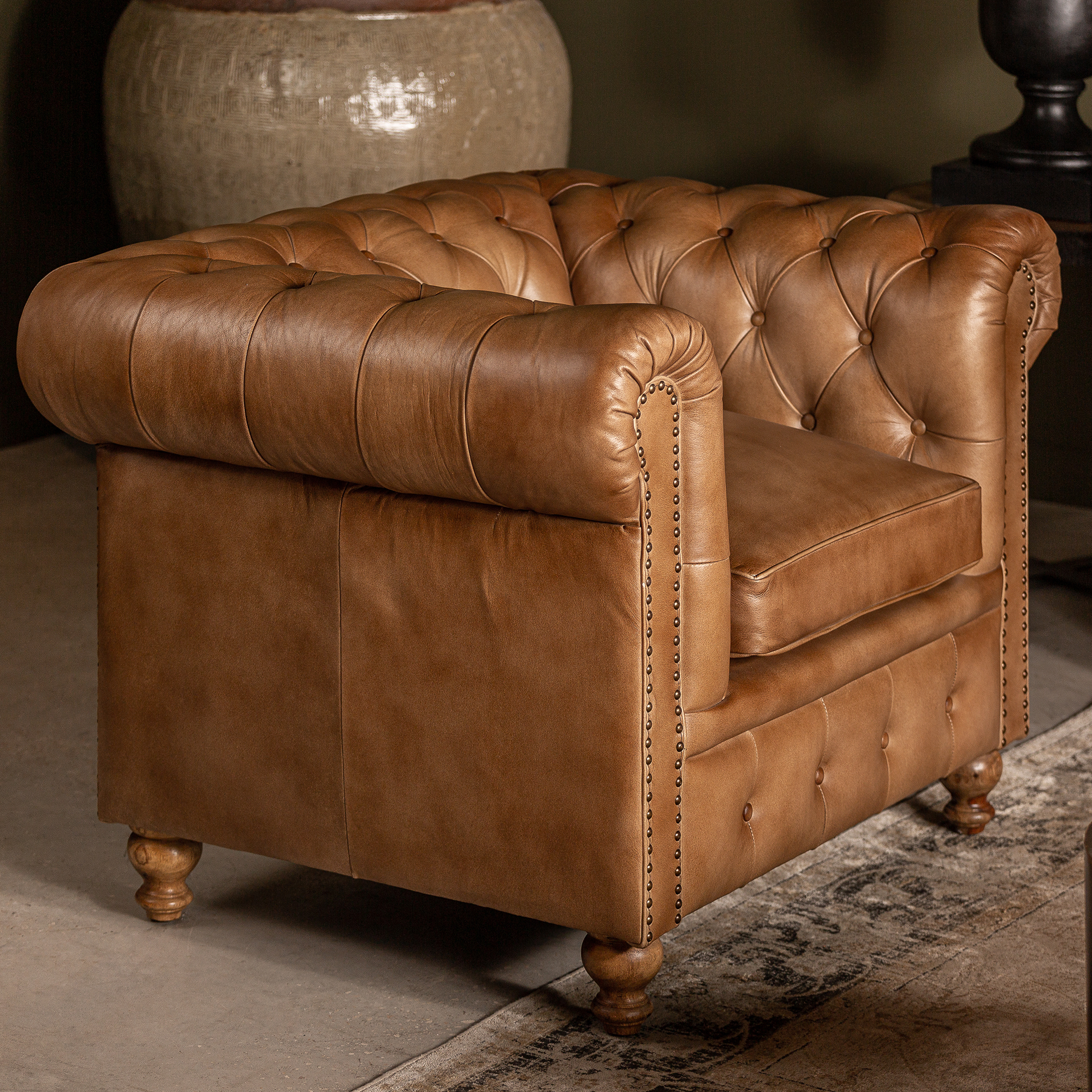 Sillón capitoné elkins, de estilo vintage. Fabricado en piel, en color marrón, combinado con madera de acacia. Producto desmontable.
