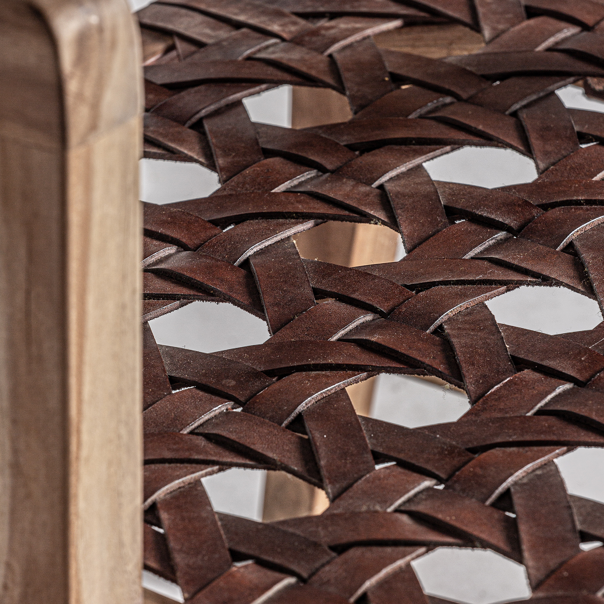 Sillón orbec, de estilo contemporáneo. Fabricado en madera de teka, en color marrón, combinado con piel.