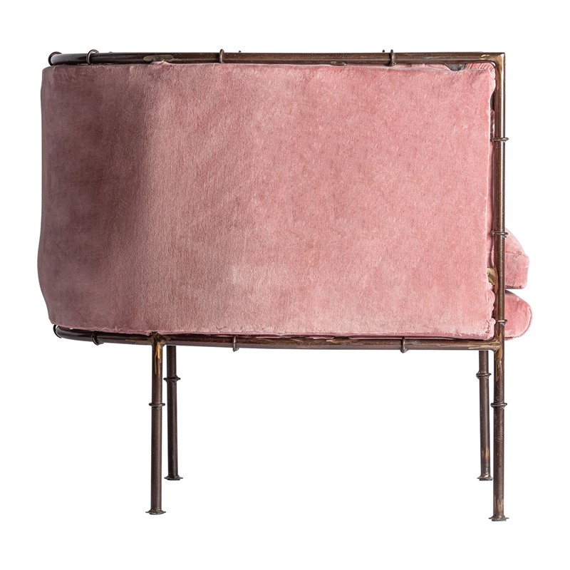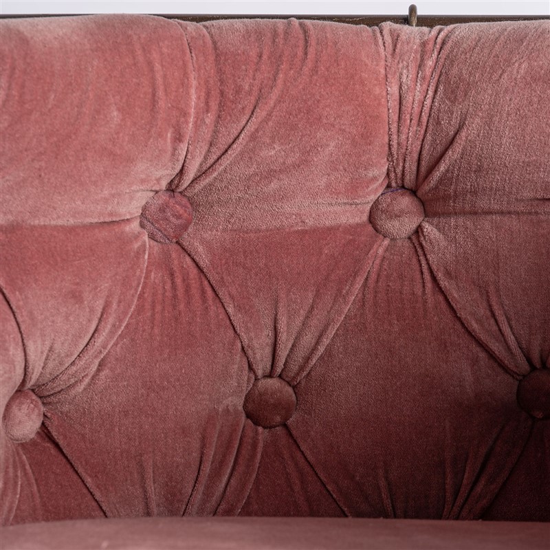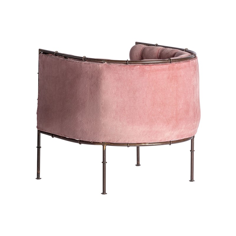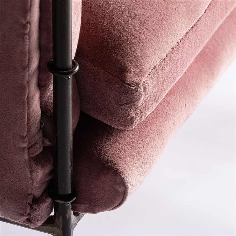 Sillón capitoné tardiano, de estilo shabby chic. Fabricado en hierro, en color rosa, combinado con terciopelo y algodón.