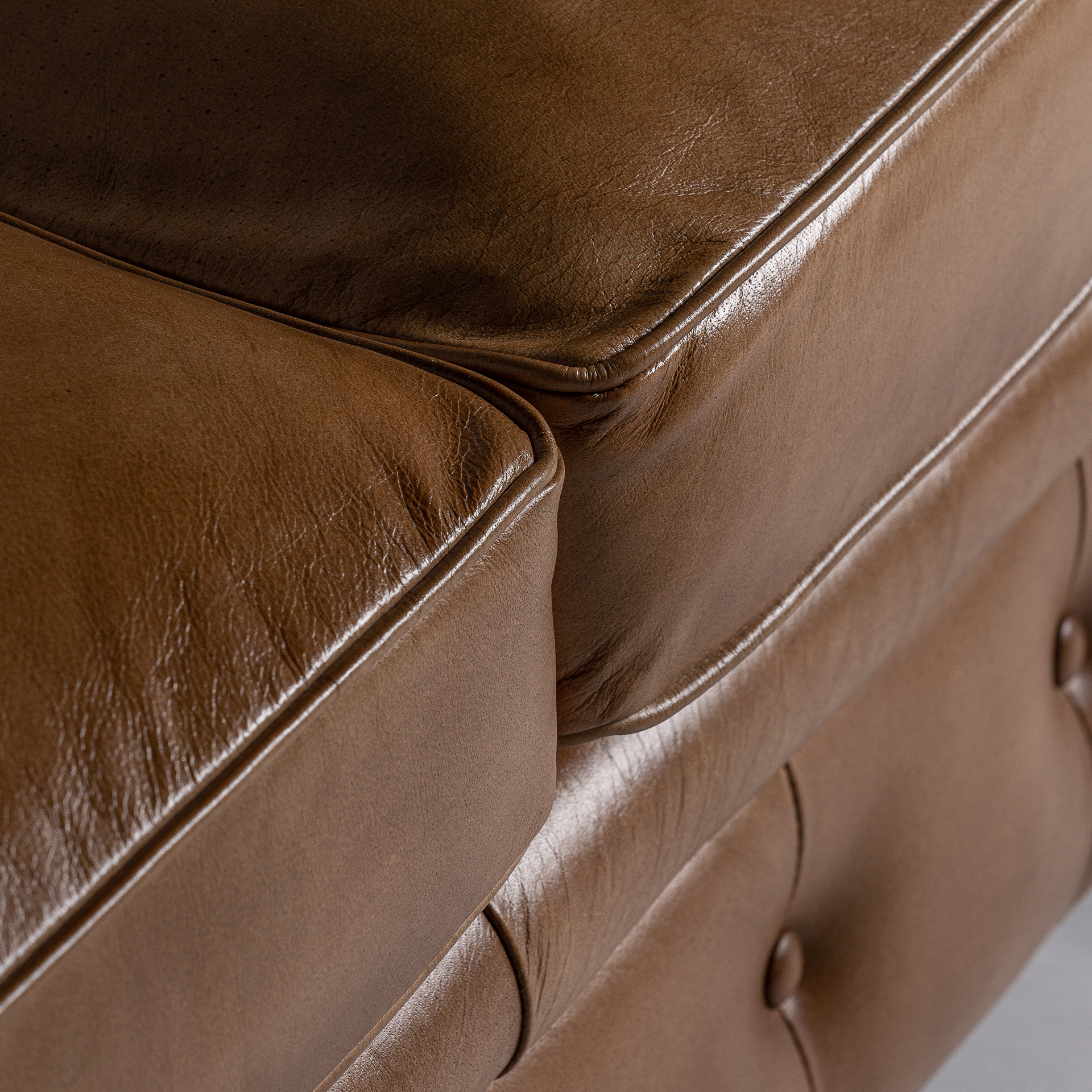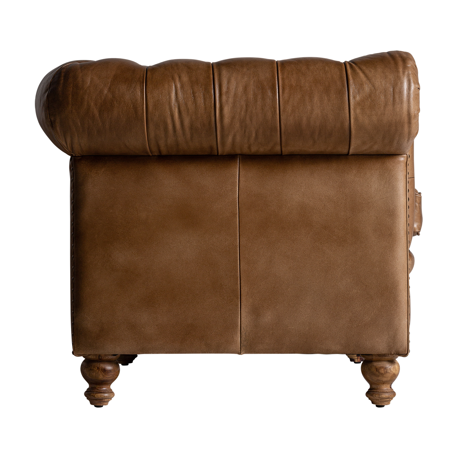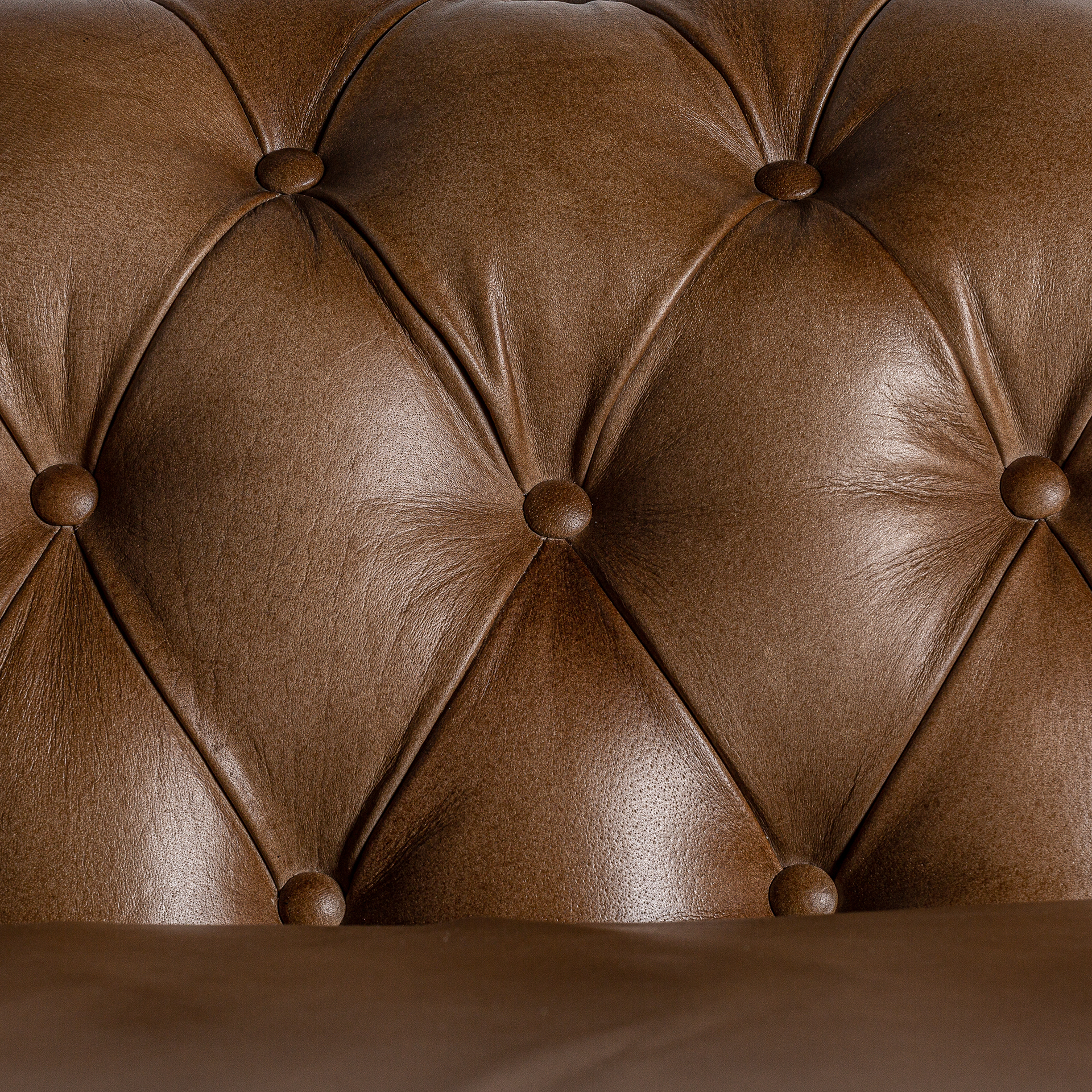 Sofá capitoné elkins, de estilo vintage. Fabricado en piel, en color marrón, combinado con madera de pino.