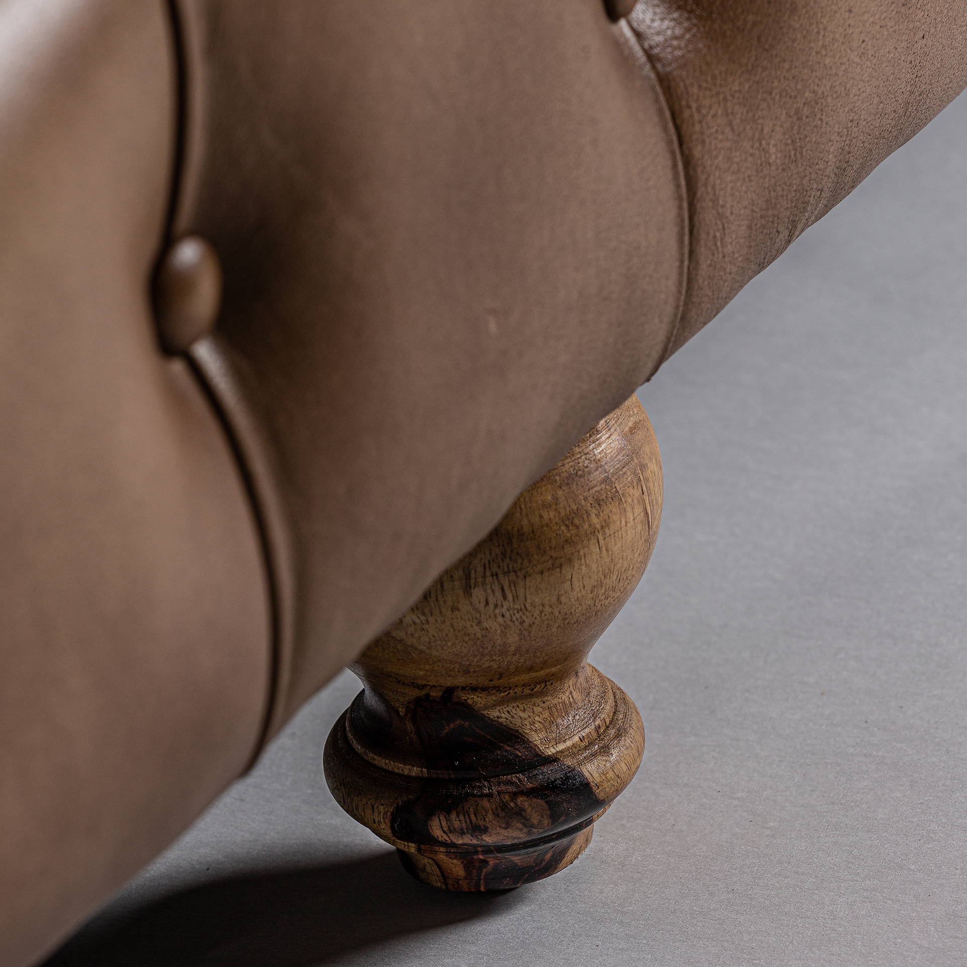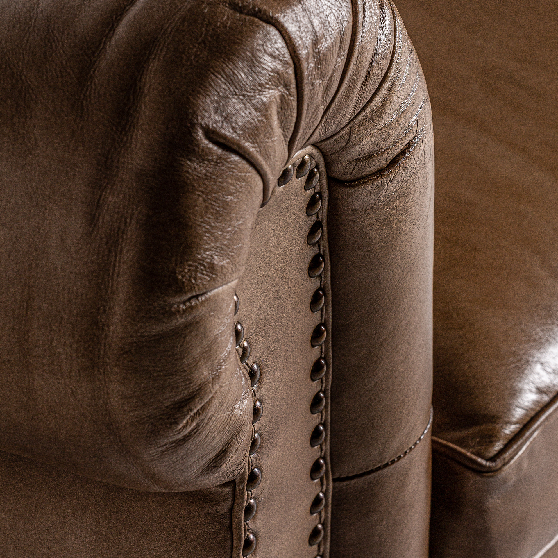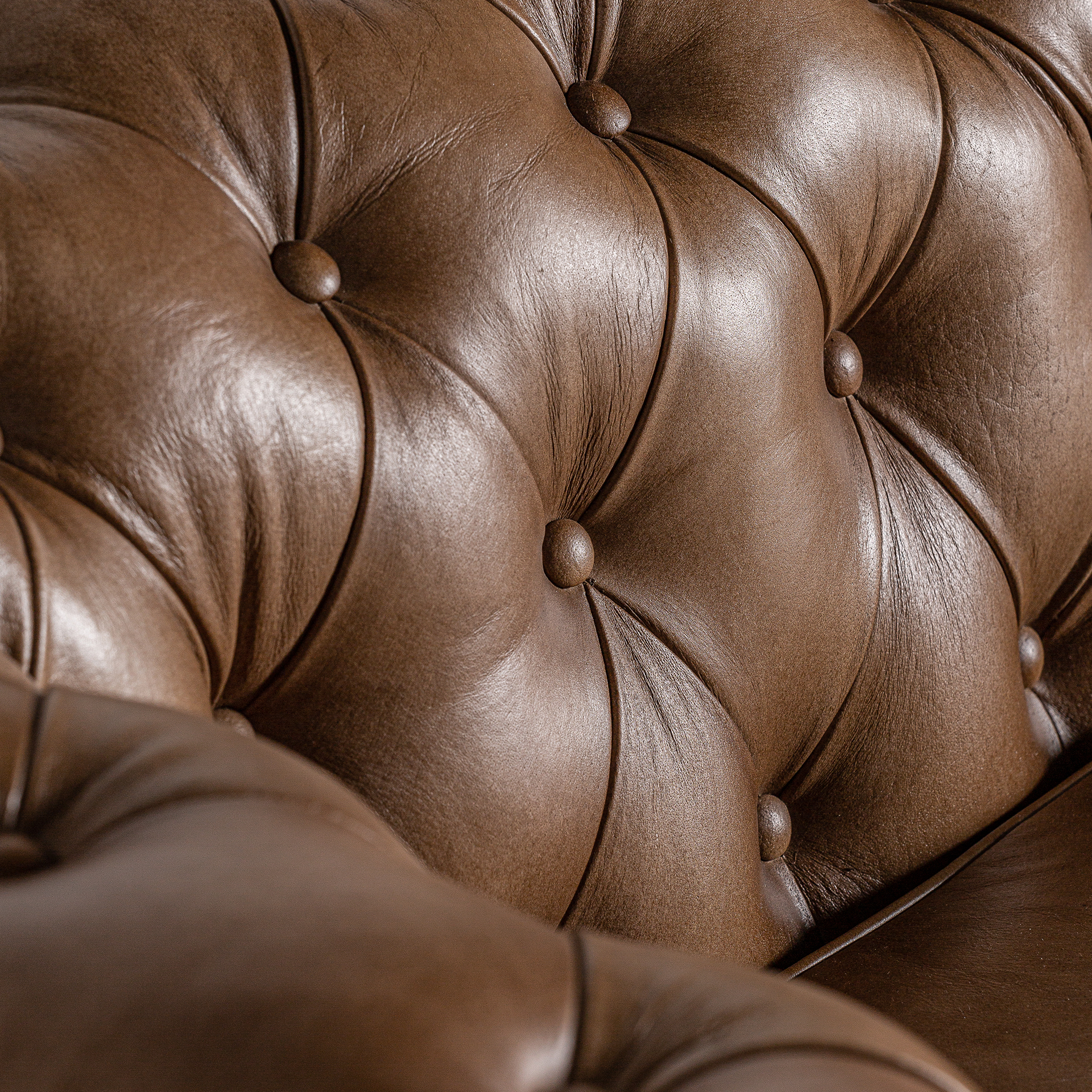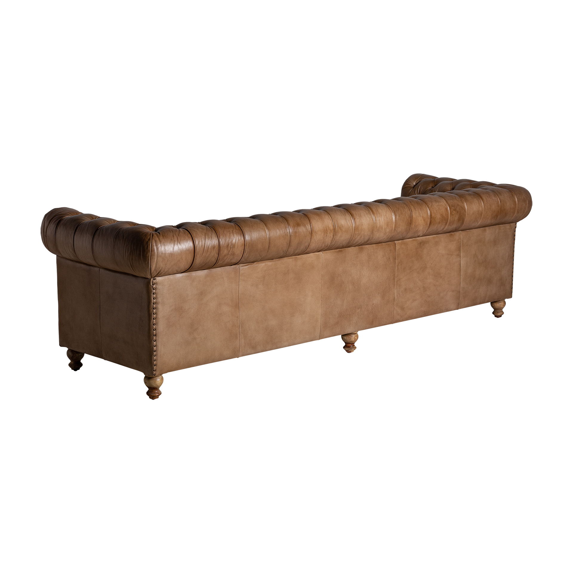 Sofá capitoné elkins, de estilo vintage. Fabricado en piel, en color marrón, combinado con madera de pino.