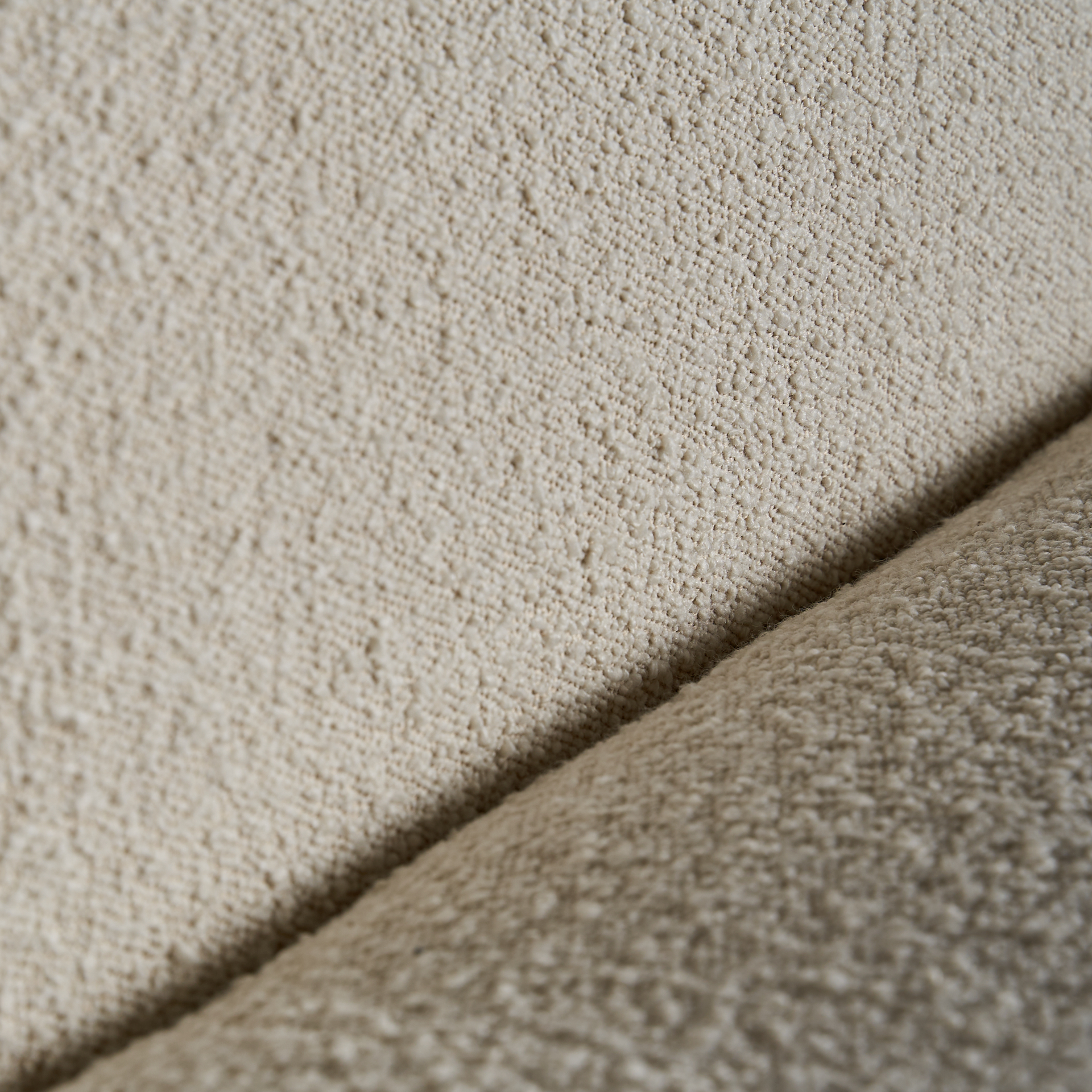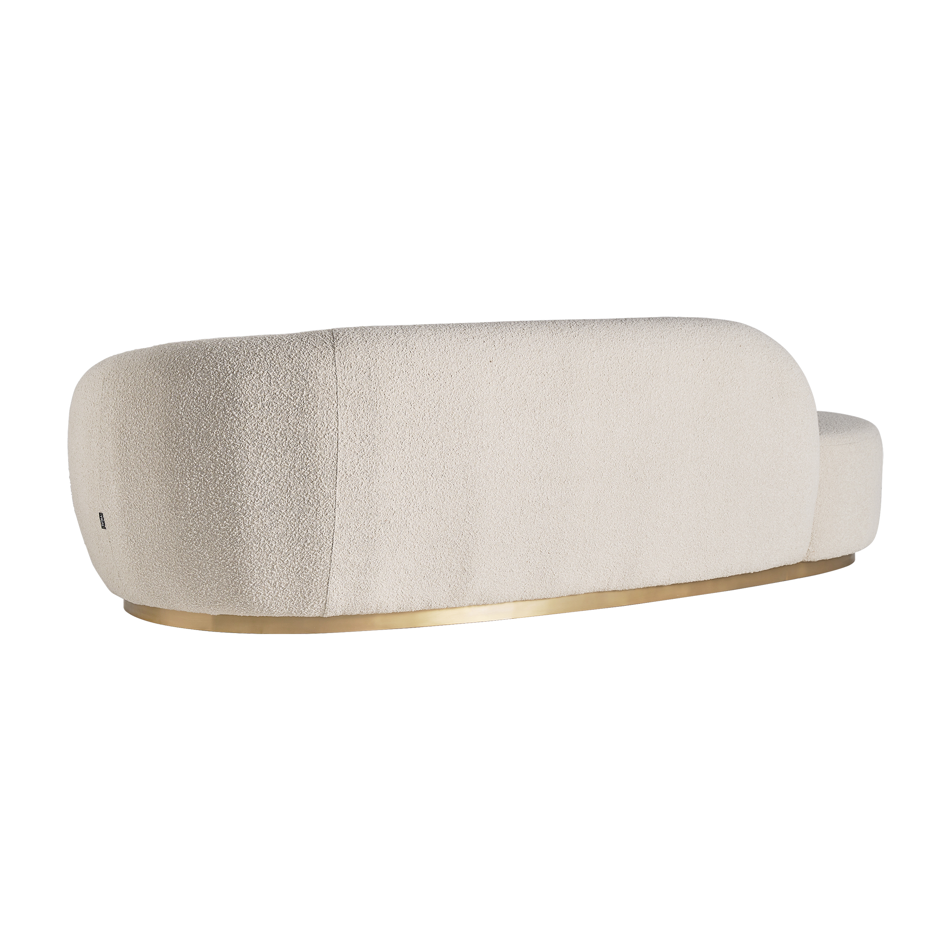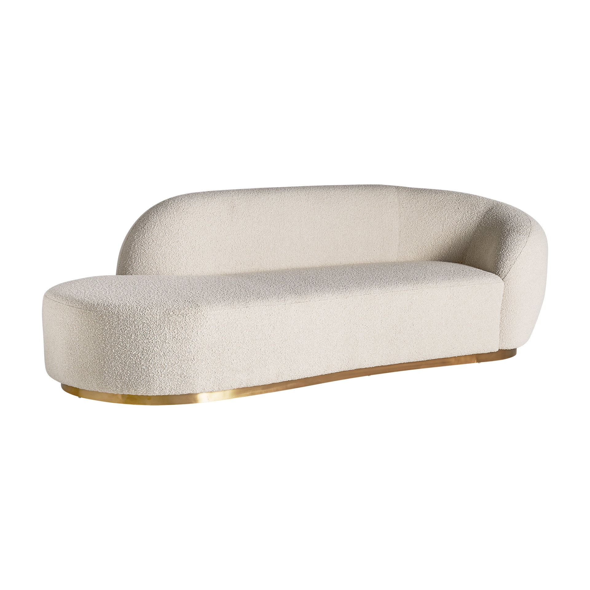 Sofá gacé, en color blanco, de estilo art deco. Fabricado en acero, combinado con madera de pino y algodón bouclé.