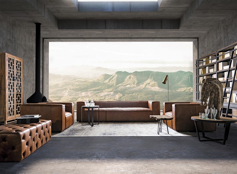 Sofá Kurza de estilo vintage, fabricado en cuero vaca en color marrón, combinado con madera de abeto y espuma. Producto desmontable.