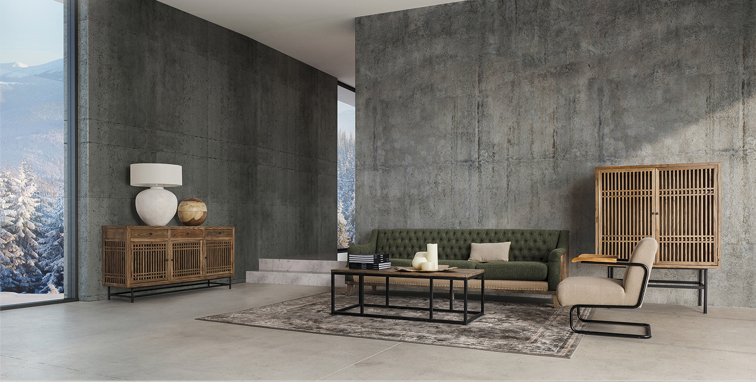 Sofá oze, de estilo vintage. Fabricado en madera de fresno, en color verde, combinado con loneta y yute. Producto desenfundable.