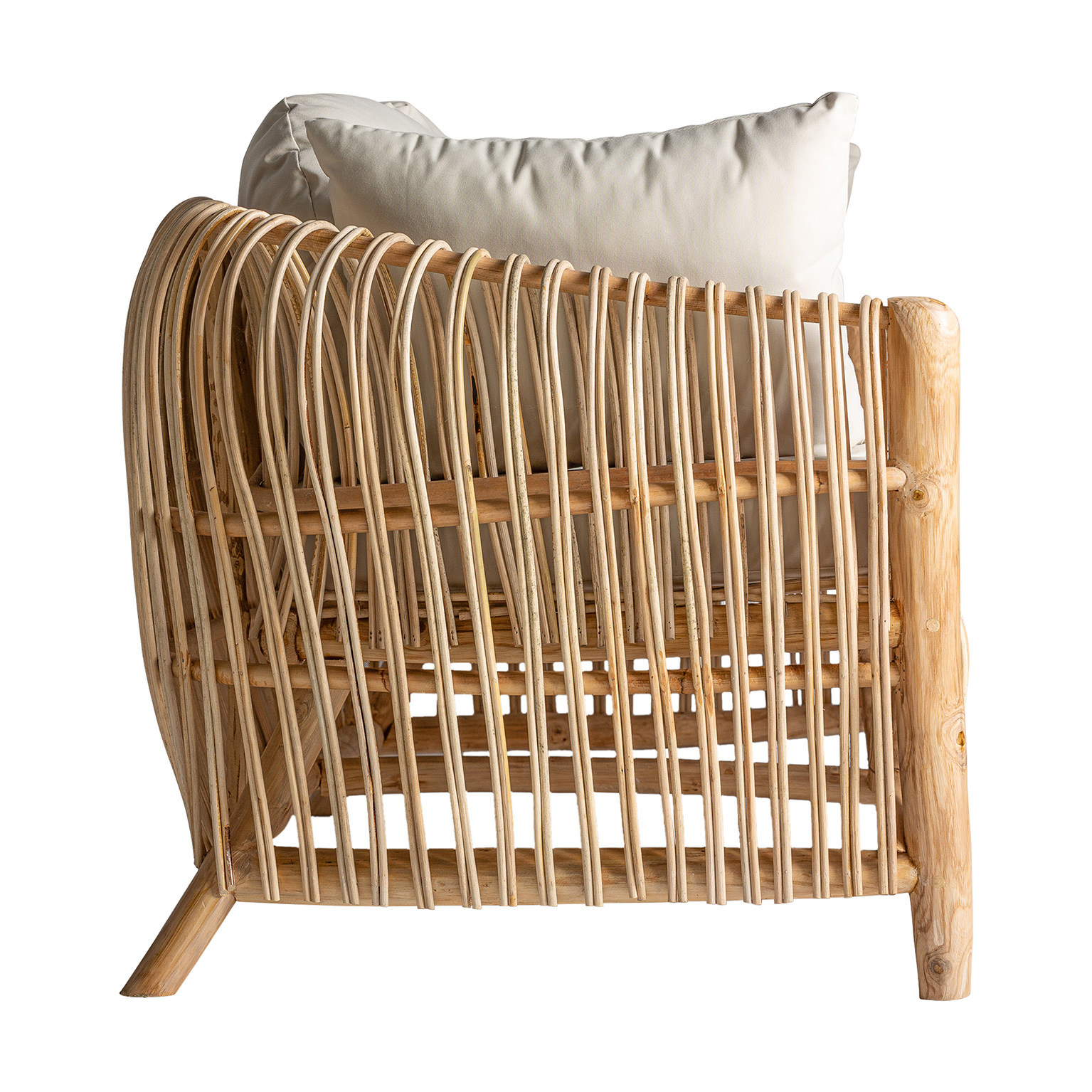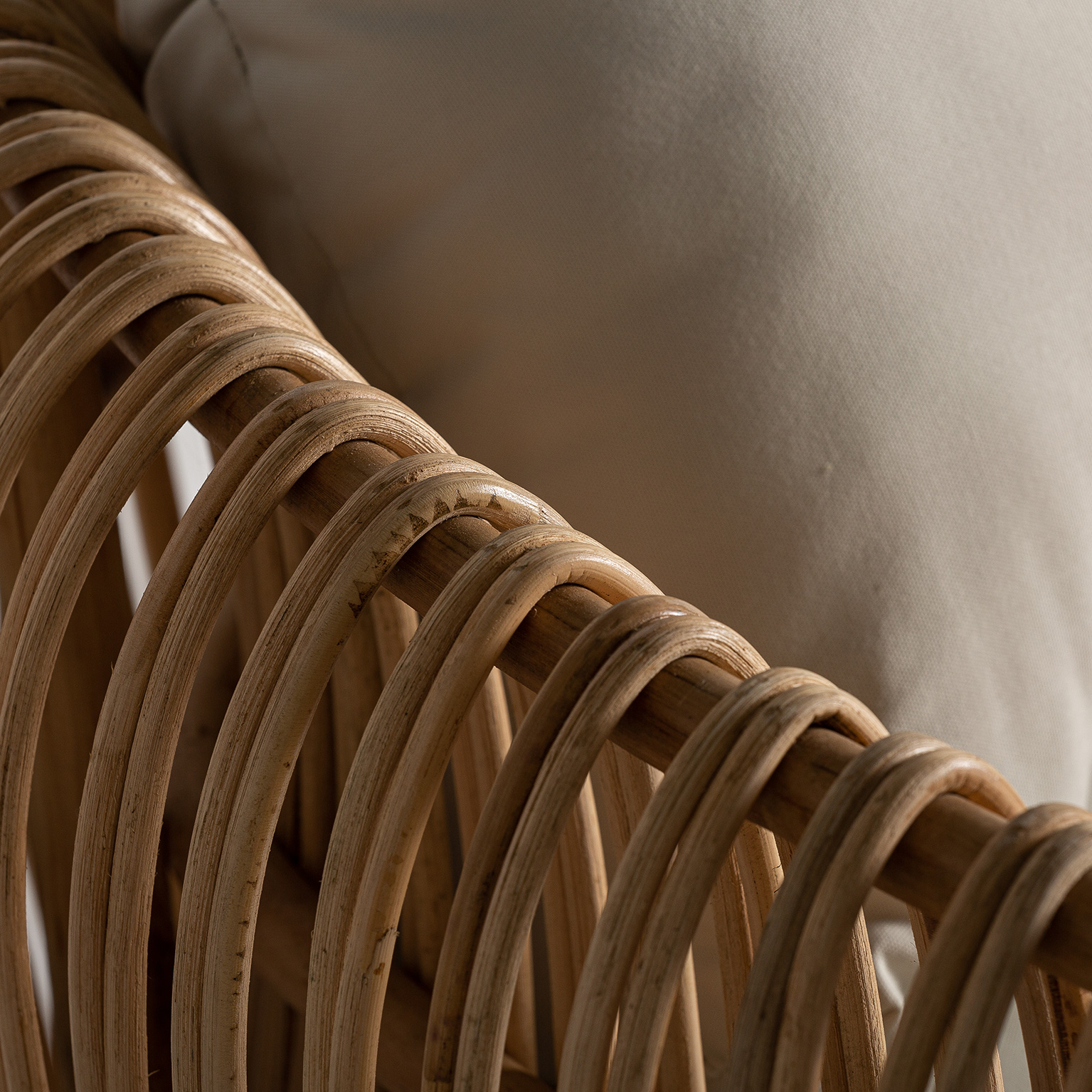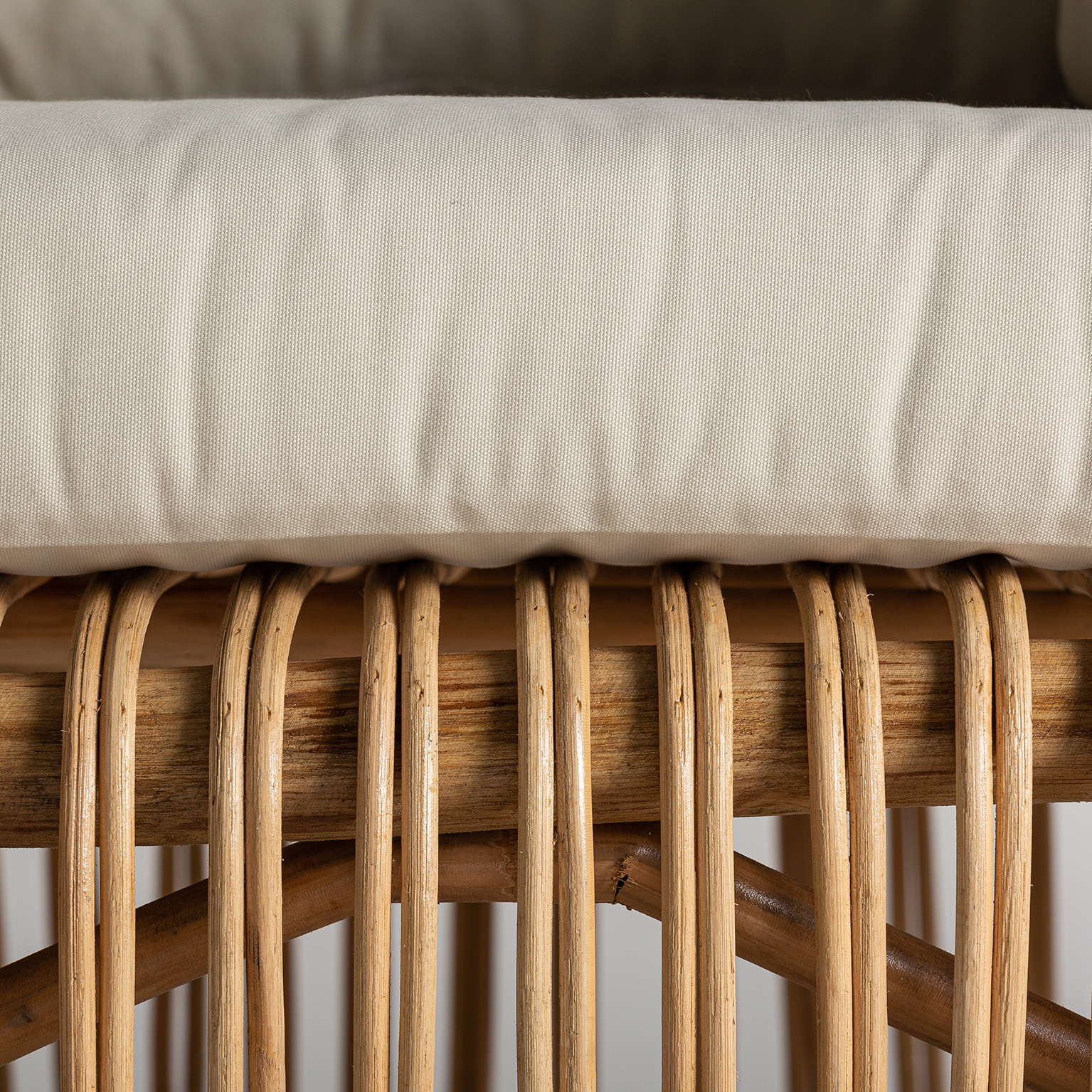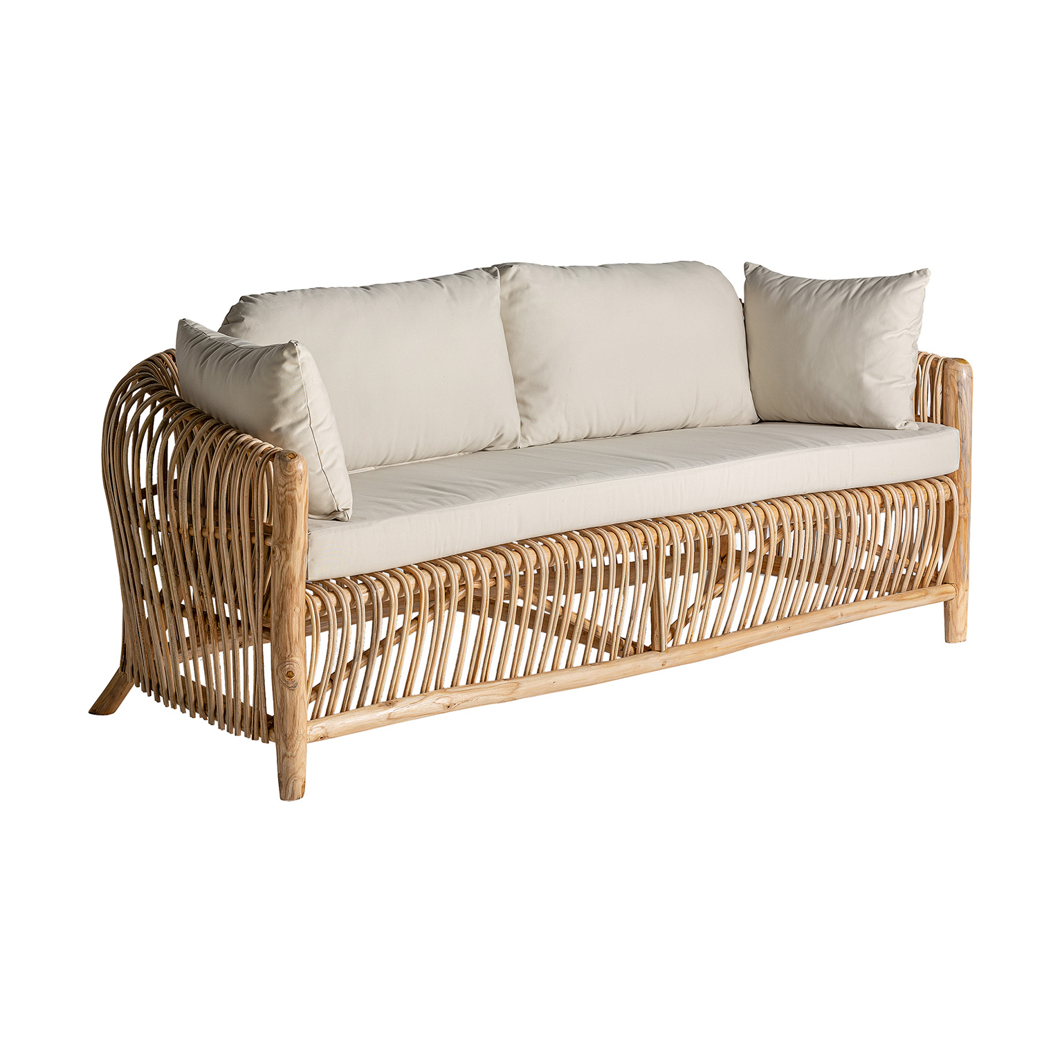 Sofá tisno, en color marrón, de estilo contemporáneo. Fabricado en ratán, combinado con algodón. Producto desmontable, desenfundable.
