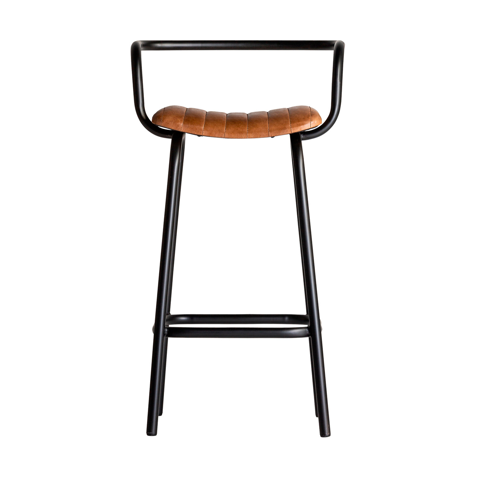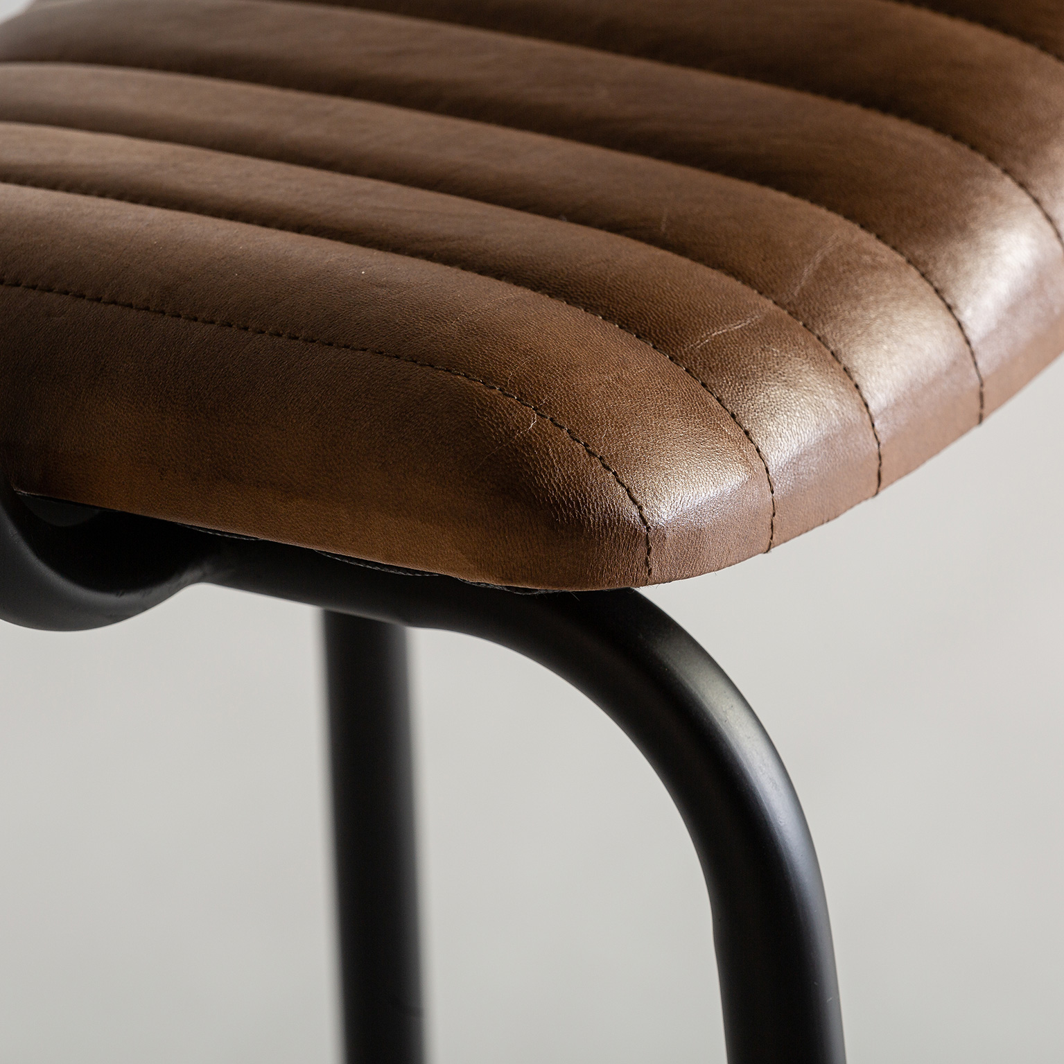 Taburete chadron, en color marrón, de estilo vintage. Fabricado en hierro, combinado con cuero. Producto plegable.